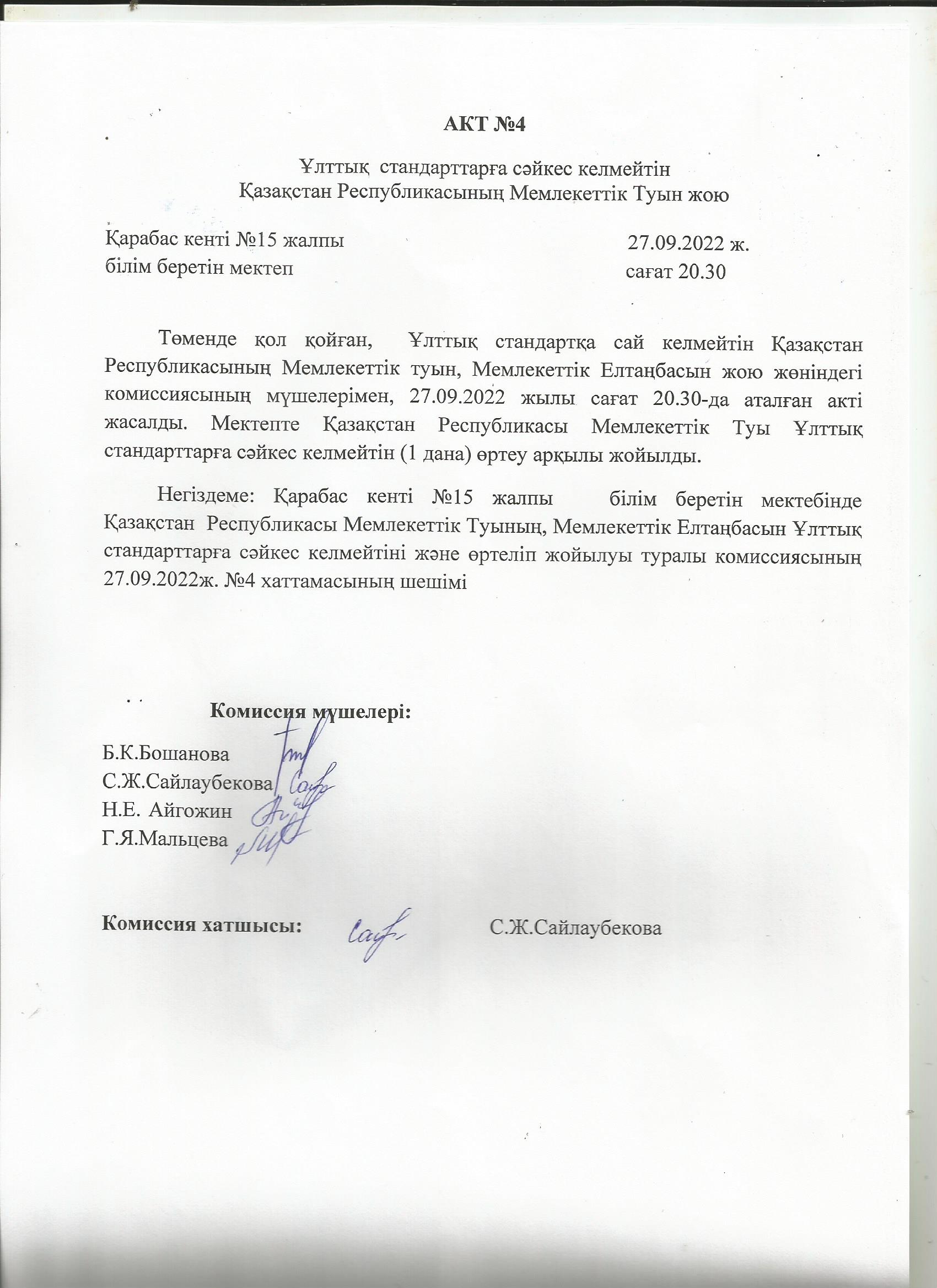Ұлттық стандарттарға сәйкес келмейтін Қазақстан Республикасының Мемлекеттік Туын жоюАкт №4 |