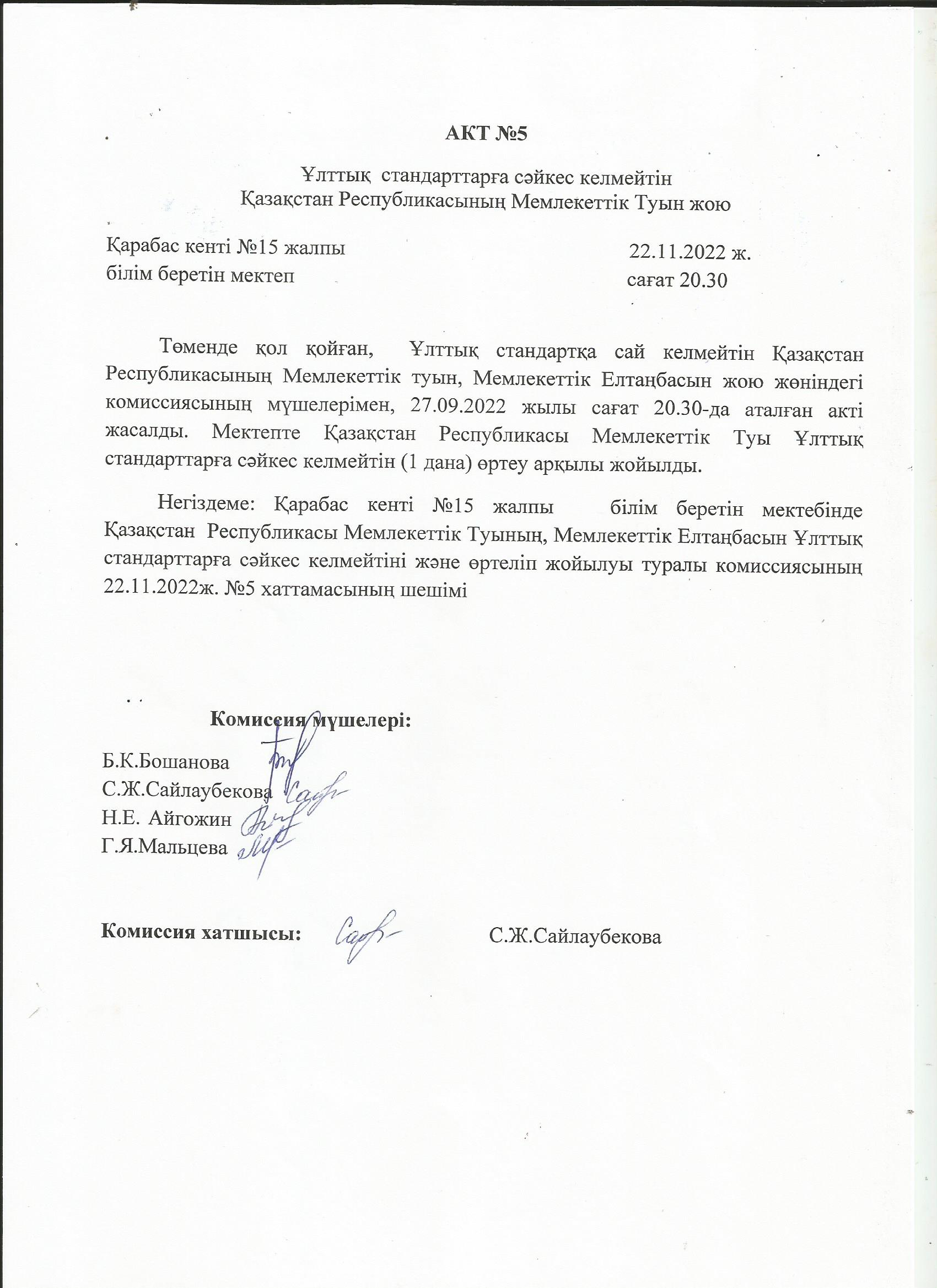 Ұлттық стандарттарға сәйкес келмейтін Қазақстан Республикасының Мемлекеттік Туын жоюАкт №5 |