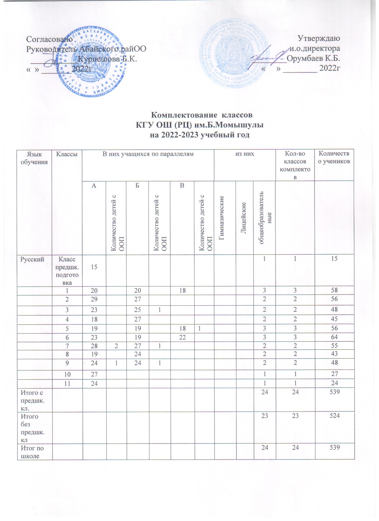 Комплектование классов 2022-2023 уч.год. |