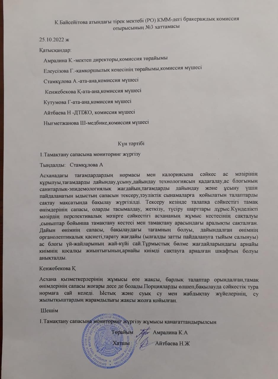 2022-2023 оқу жылындағы тамақтану сапасына мониторинг жүргізу жөніндегі бракераж комиссиясының жоспарыТамақтану сапасына мониторинг |