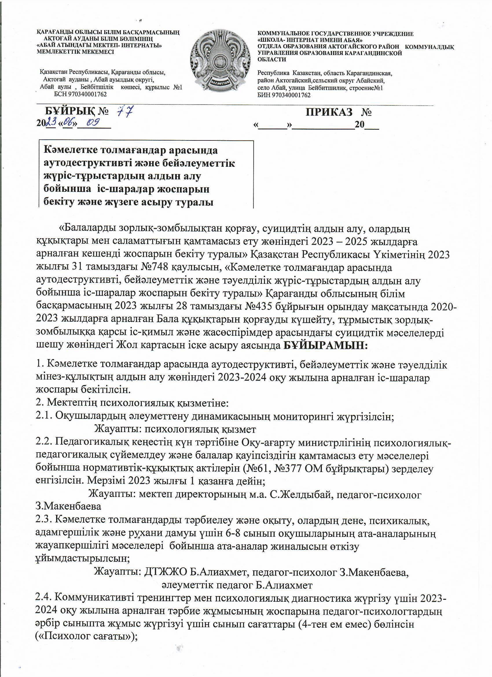 Кәмелетке толмағандар арасында аутодеструктивті жүріс-тұрыстың алдын алу бойынша іс-шаралар жоспарын жүзеге асыру туралыаутодеструктивті жүріс-тұрыстың алдын алу бұйрық |