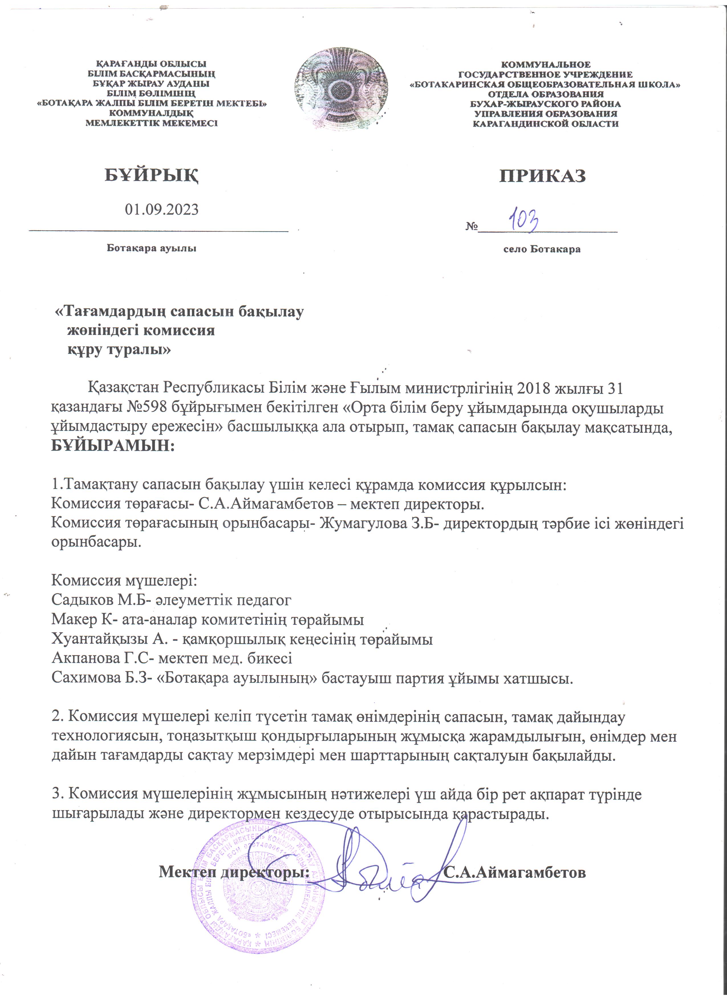 Тағамдардың сапасын бақылау жөніндегі комиссия құру туралы бұйрықТағамдардың сапасын бақылау жөніндегі комиссия құру туралы бұйрық |