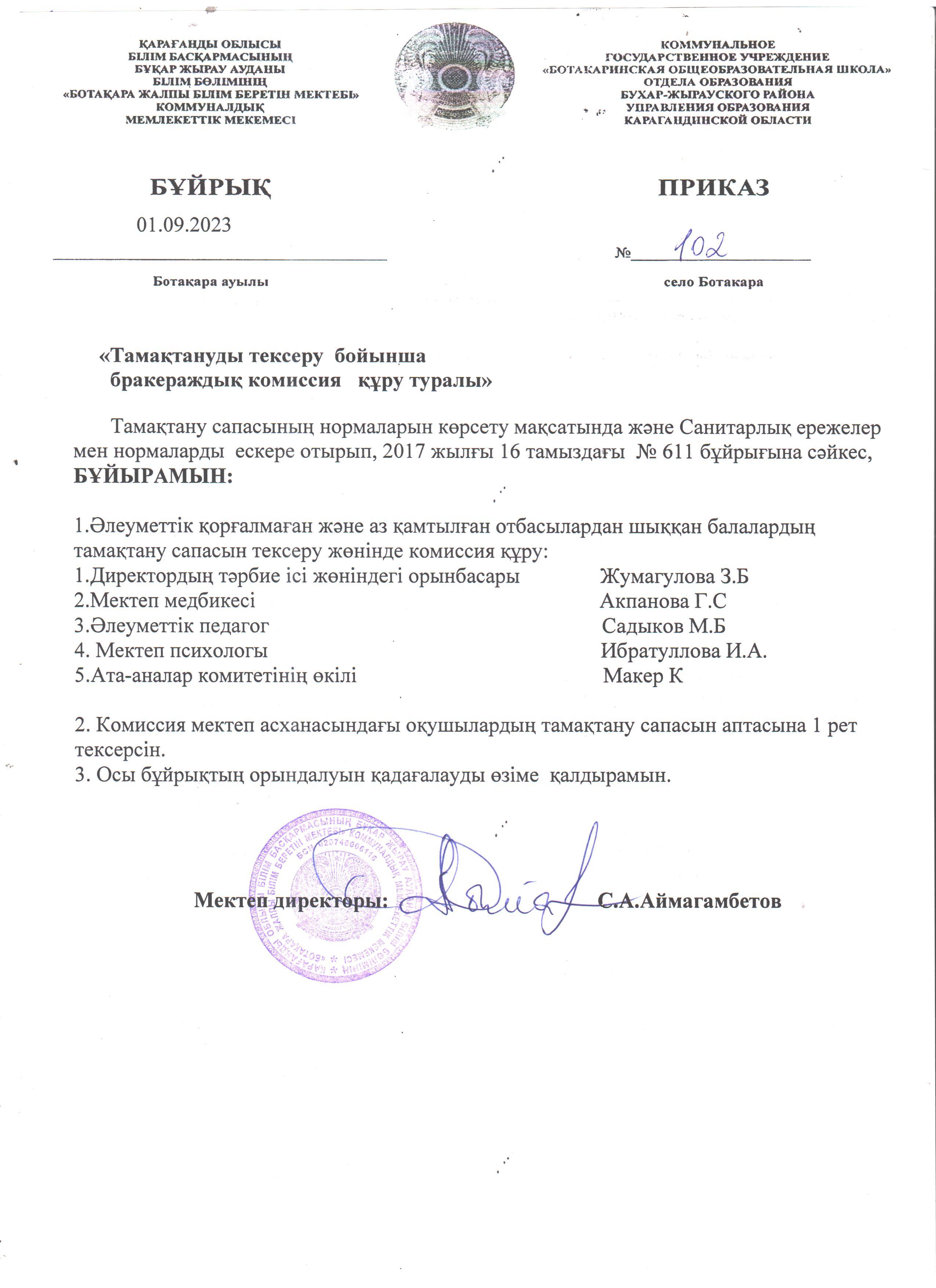 Тамақтану тексеру бойынша бракераждық комиссия құру туралы бұйрық Тамақтану тексеру бойынша бракераждық комиссия құру туралы бұйрық |