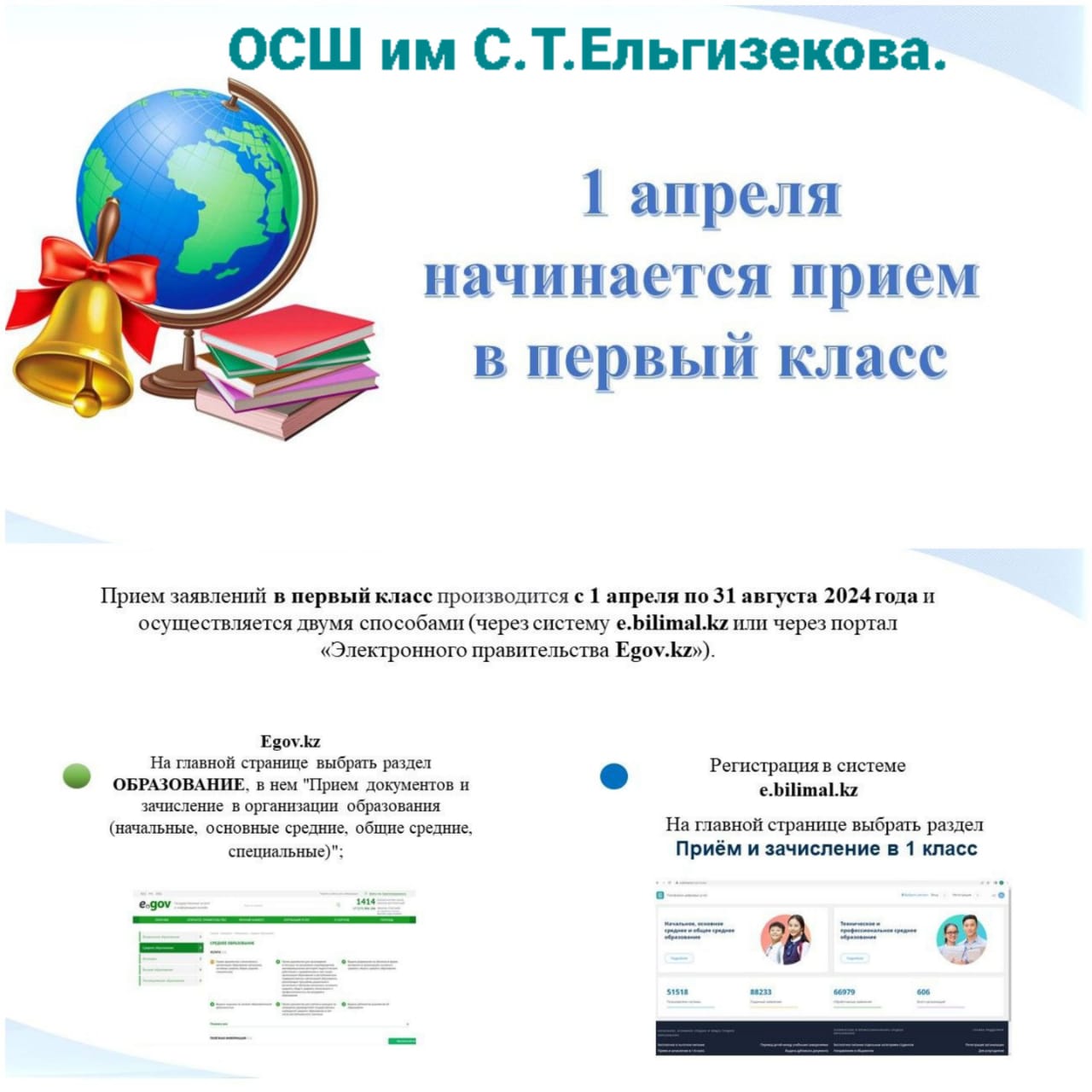 Прием 1 классПрием документов от родителей или законных представителей ребенка, поступающих в первый класс, производится с 1 апреля по 31 августа 2024 года через порталы e.gov или e.bilimal.kz.