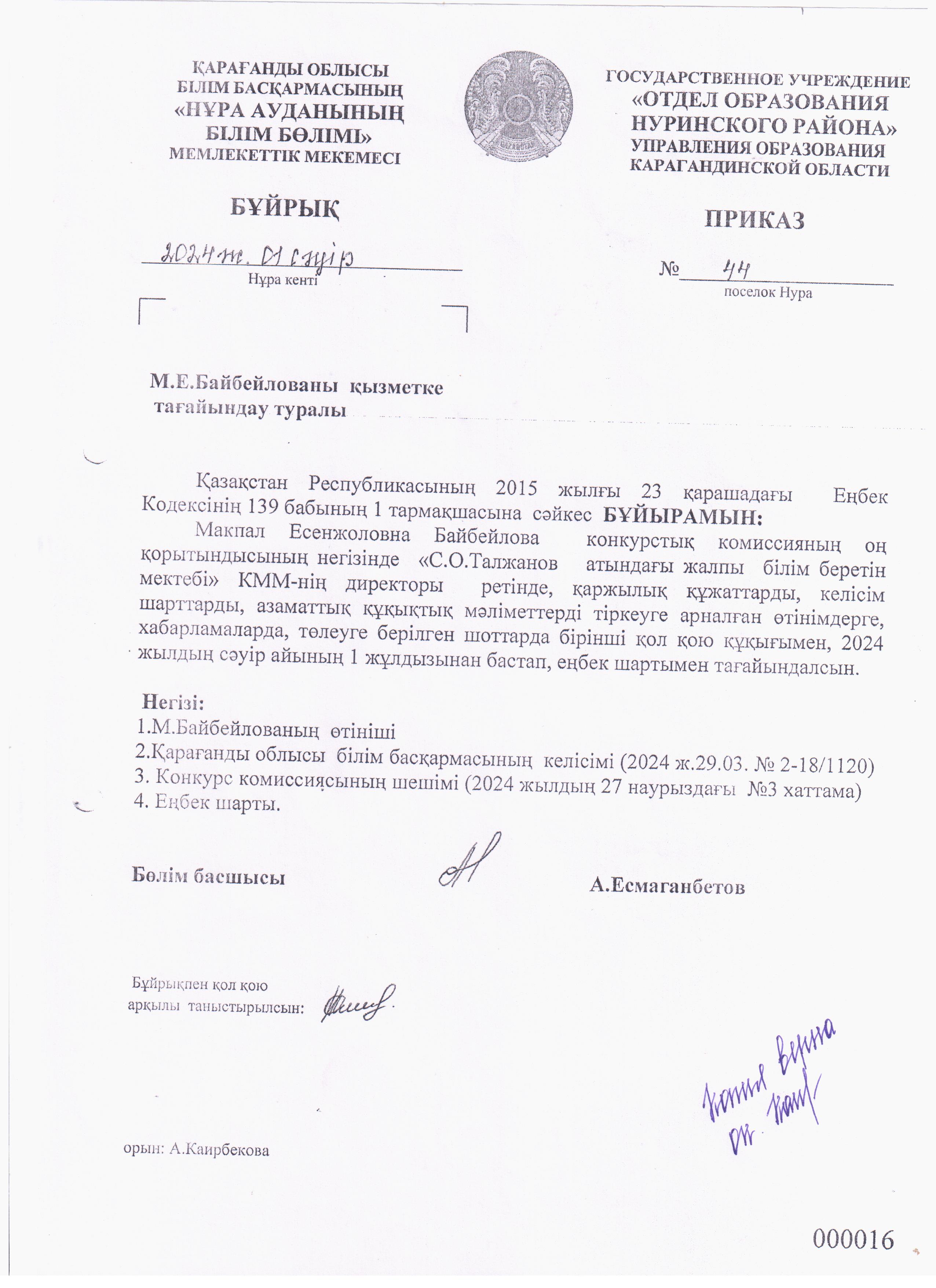 ПриказПриказ о назначении директора Байбейловой М.Е. |
