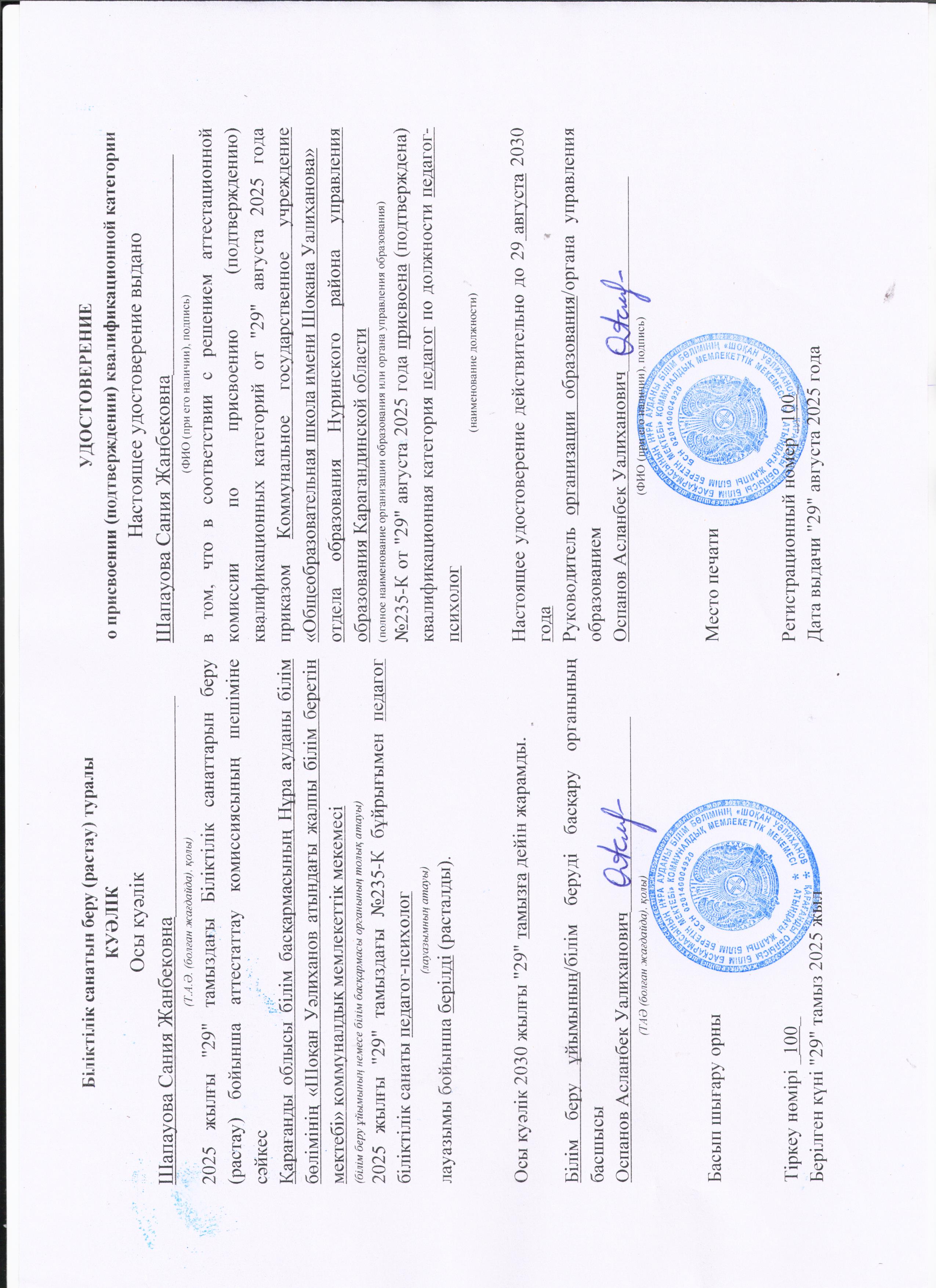 Біліктілік санатын беру куәлігі педагог-психолог Шапауова С.Ж29.08.2025 ж |