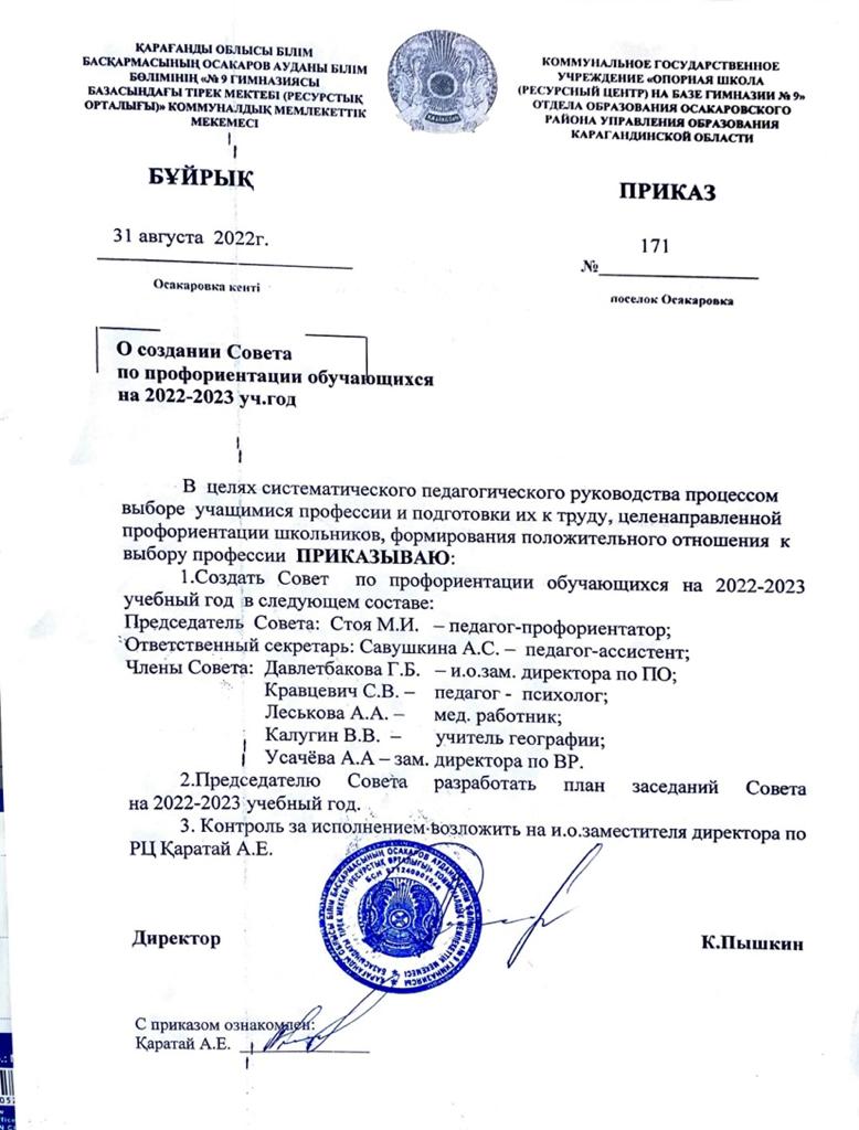 Приказ о создании совета по профориентации на 2022-2023 учебный год- |