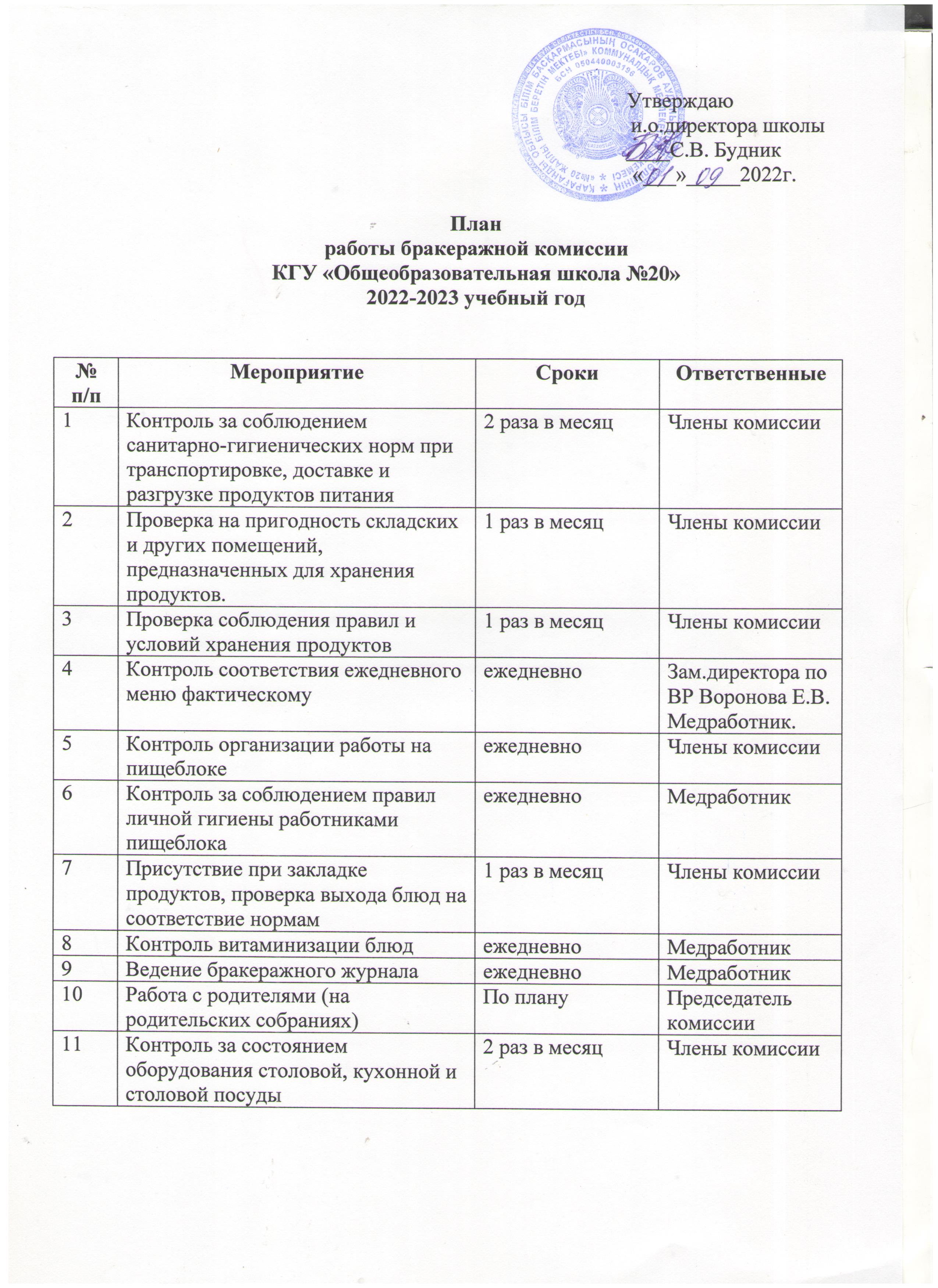 План бракеражной комиссии. |