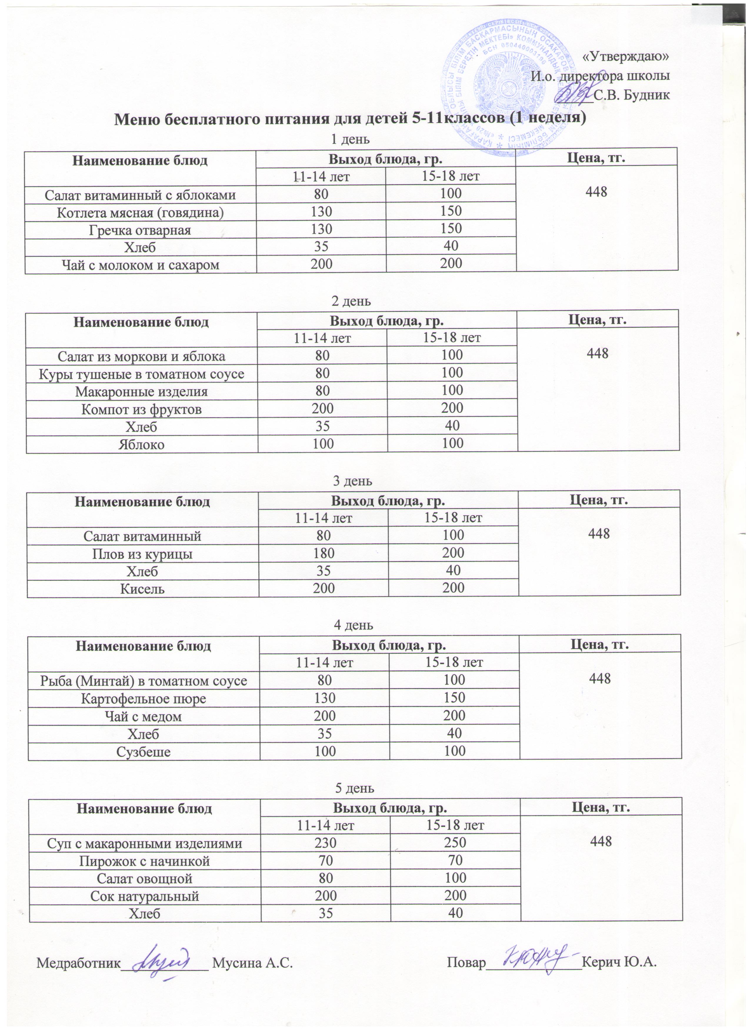 Меню бесплатного питания 5-11 кл. 1 неделя. |