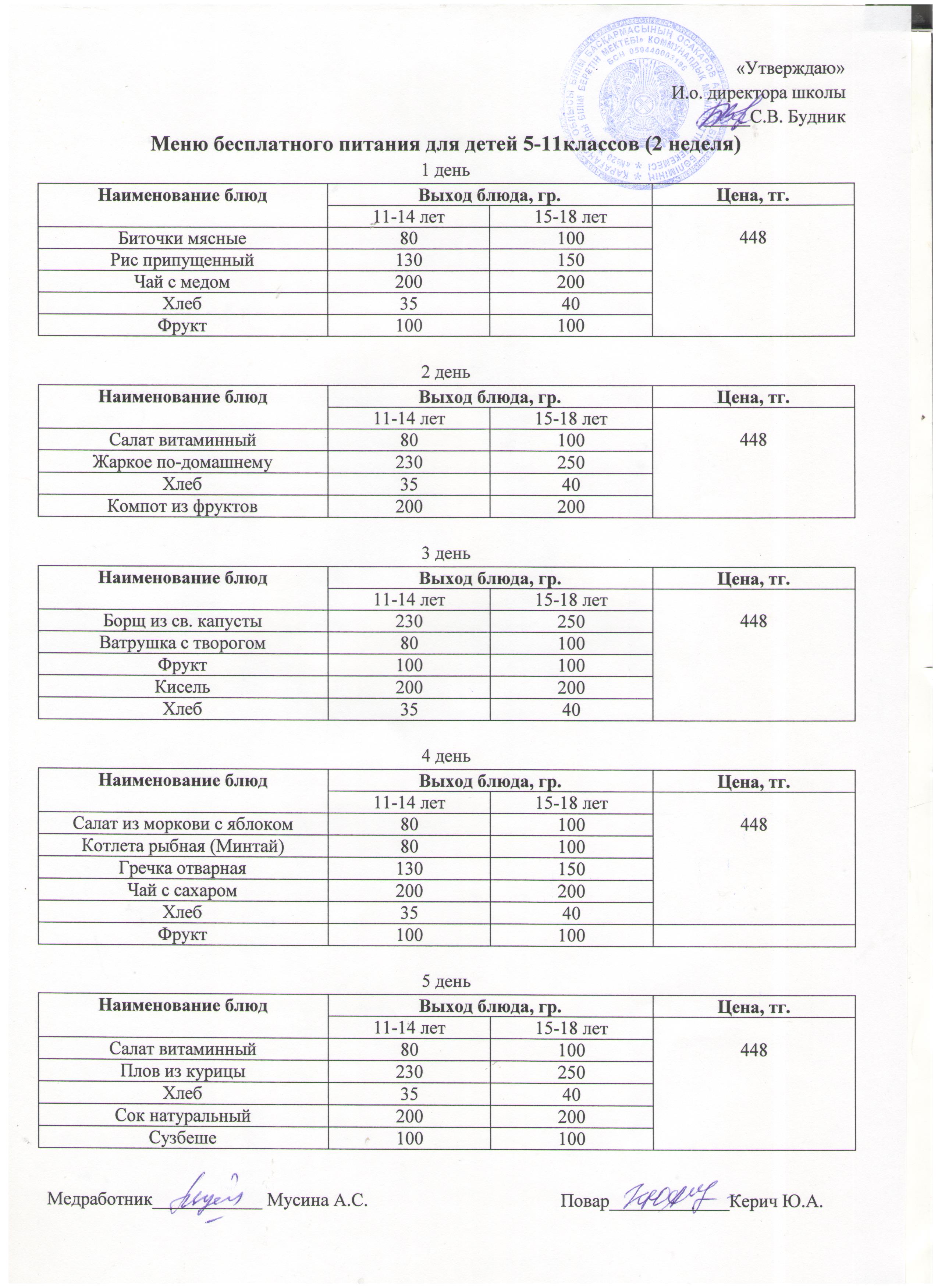 Меню бесплатного питания 5-11 кл. 2 неделя. |