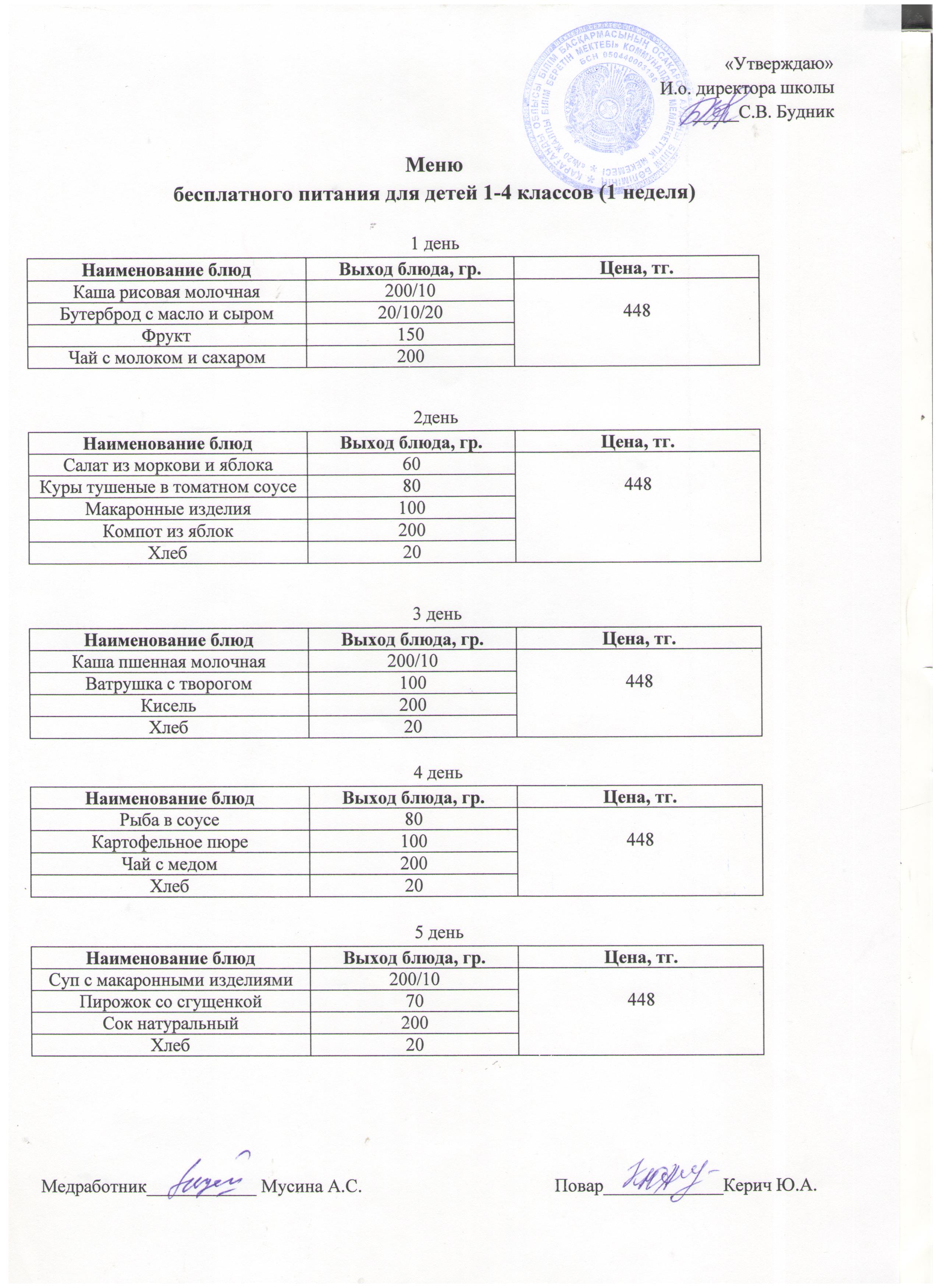 Меню бесплатного питания 1-4 кл. 1 неделя. |