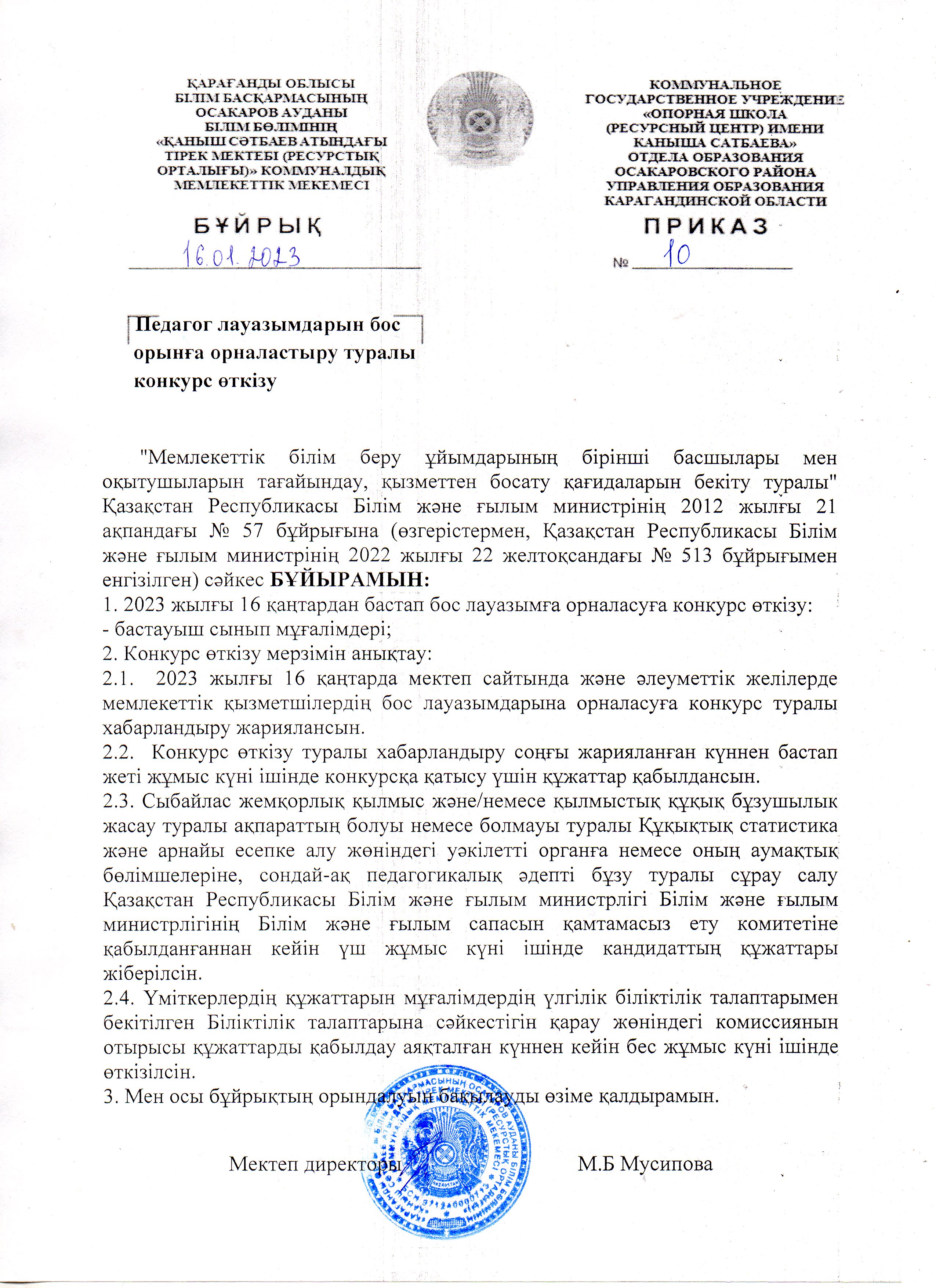 ПРИКАЗ "О проведении конкурса на занятие вакантной должности педагога"В соответствии с Приказом Министра образования и науки Республики Казахстан от 21 февраля 2012 года № 57 (в редакции приказа Министра образования и науки Республики Казахстан от 22.12.2022 года №513) «Об утверждении правил назначения на должности, освобождения от должностей первых руководителей и педагогов государственных организаций образования» ПРИКАЗЫВАЮ: |