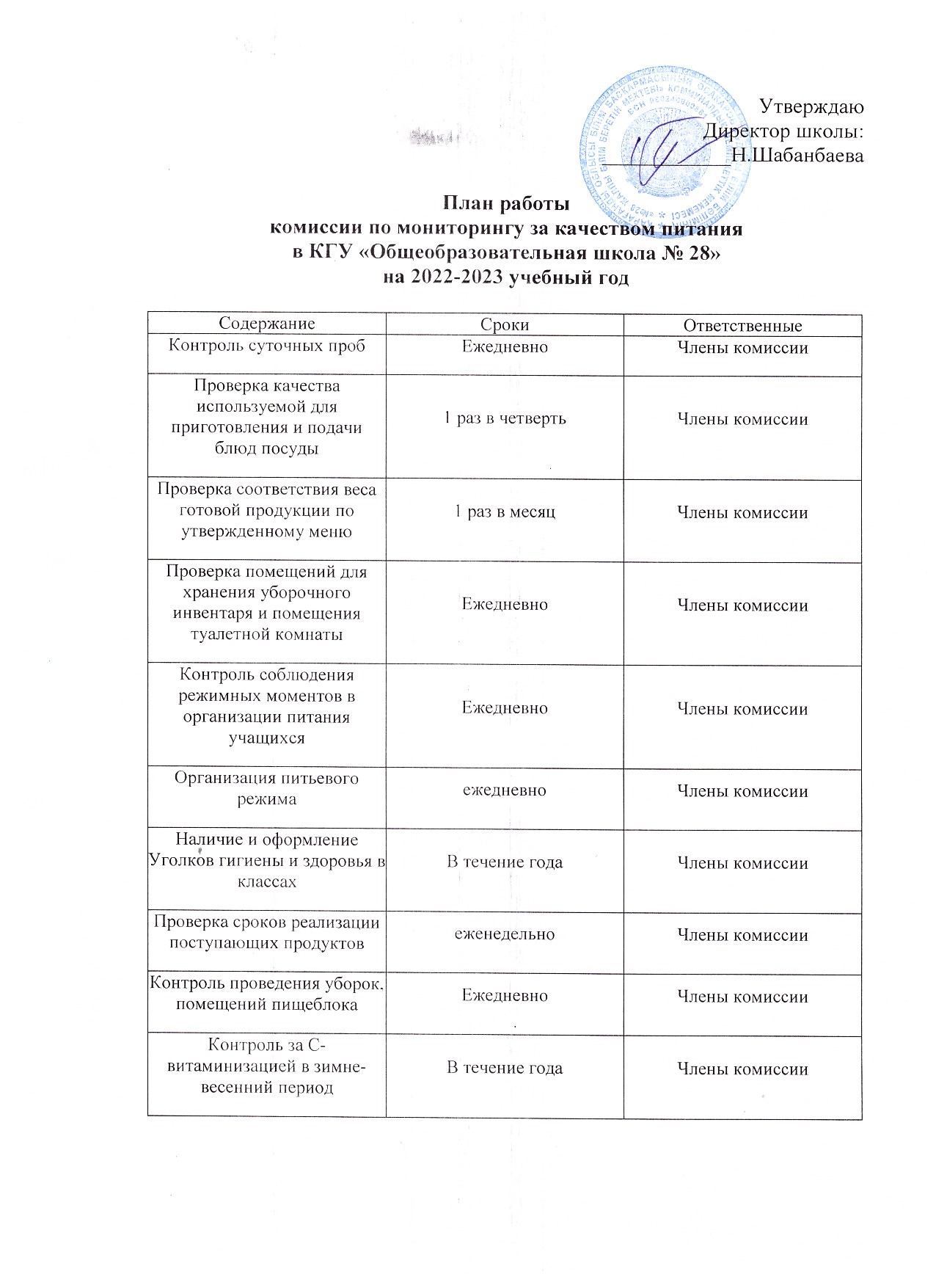 План работы комиссии по мониторингу за качеством питания на 2022 - 2023 учебный год. |