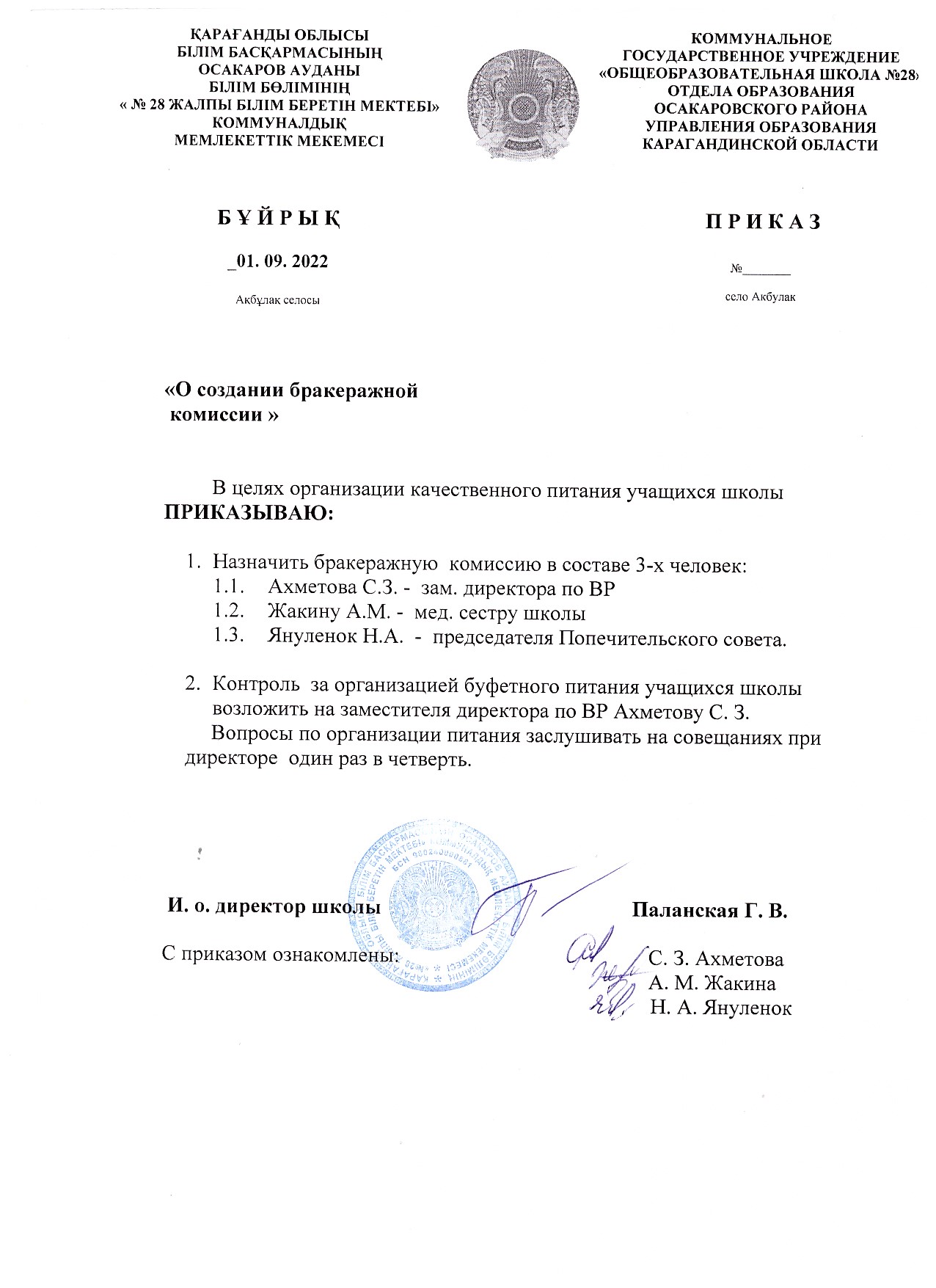 Приказ о создании бракеражной комиссии