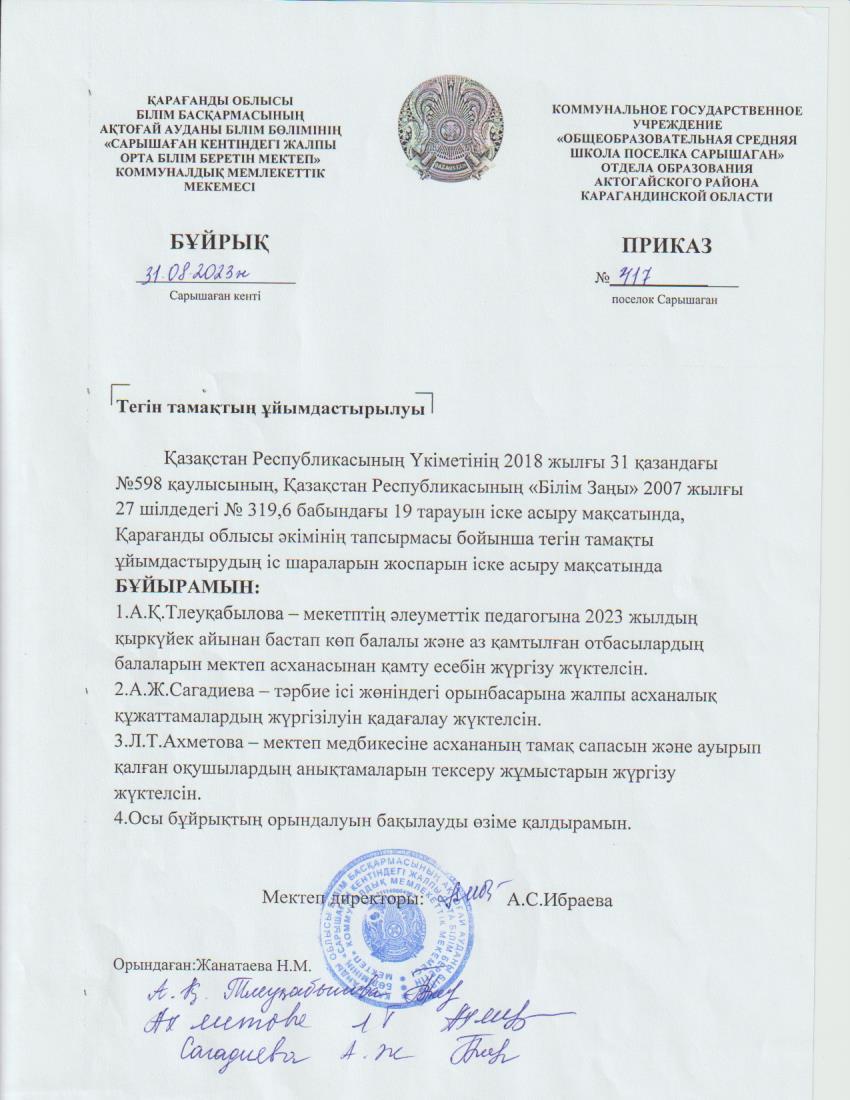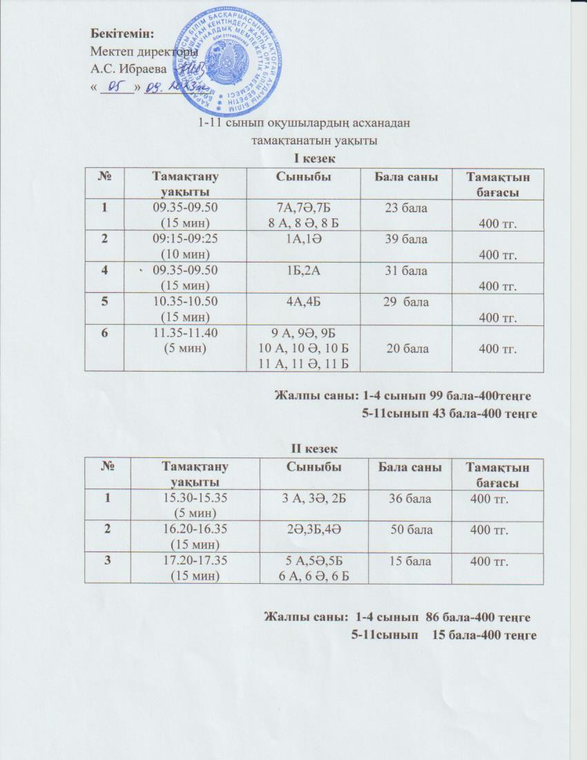 Мектепте буфеттік жүйедегі тамақтандыру жұмыстары ұйымдастырылған: тағам дайындау, ыстық тамақ әзірлеу, буфеттік зиянсыз өнімдер. Мектеп асханадағы тамақтануды ұйымдастыру кезінде Қазақстан Республикасы Бас мемлекеттік санитарлық дәрігерінің 2020 жылғы 25 желтоқсандағы №67 қаулысымен бекітілген мектеп асханалары қызметінің тәртібіне қойылатын талаптары қатаң сақталынуда. Оқу жылының басында ата-аналар қоғамы мен мектеп әкімшілігі қатарынан бракераждық комиссия құрылды.
