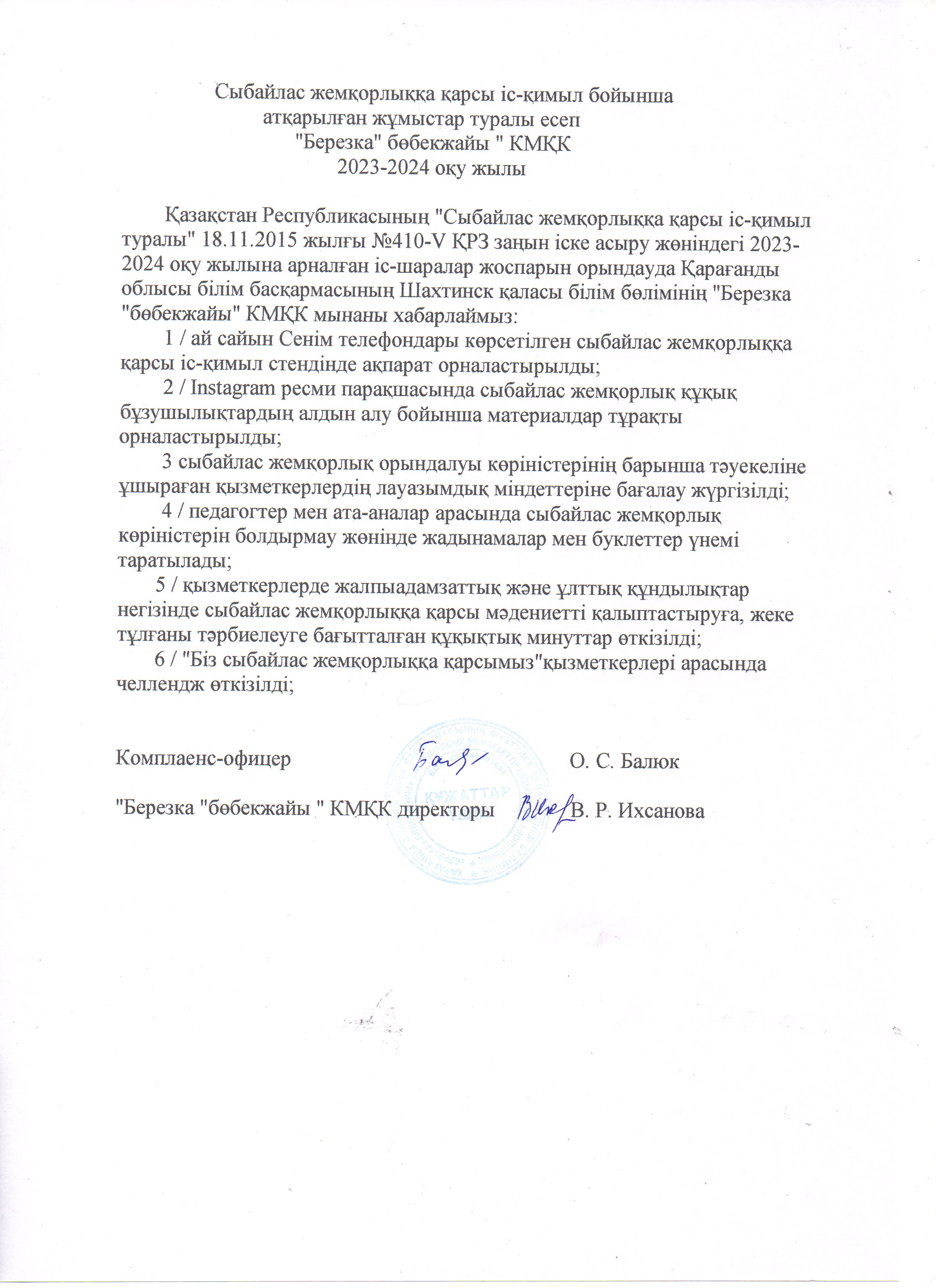 Отчет о проделанной работе по противодействию коррупции КГКП «Ясли-сад «Березка» 2023-2024 учебный год