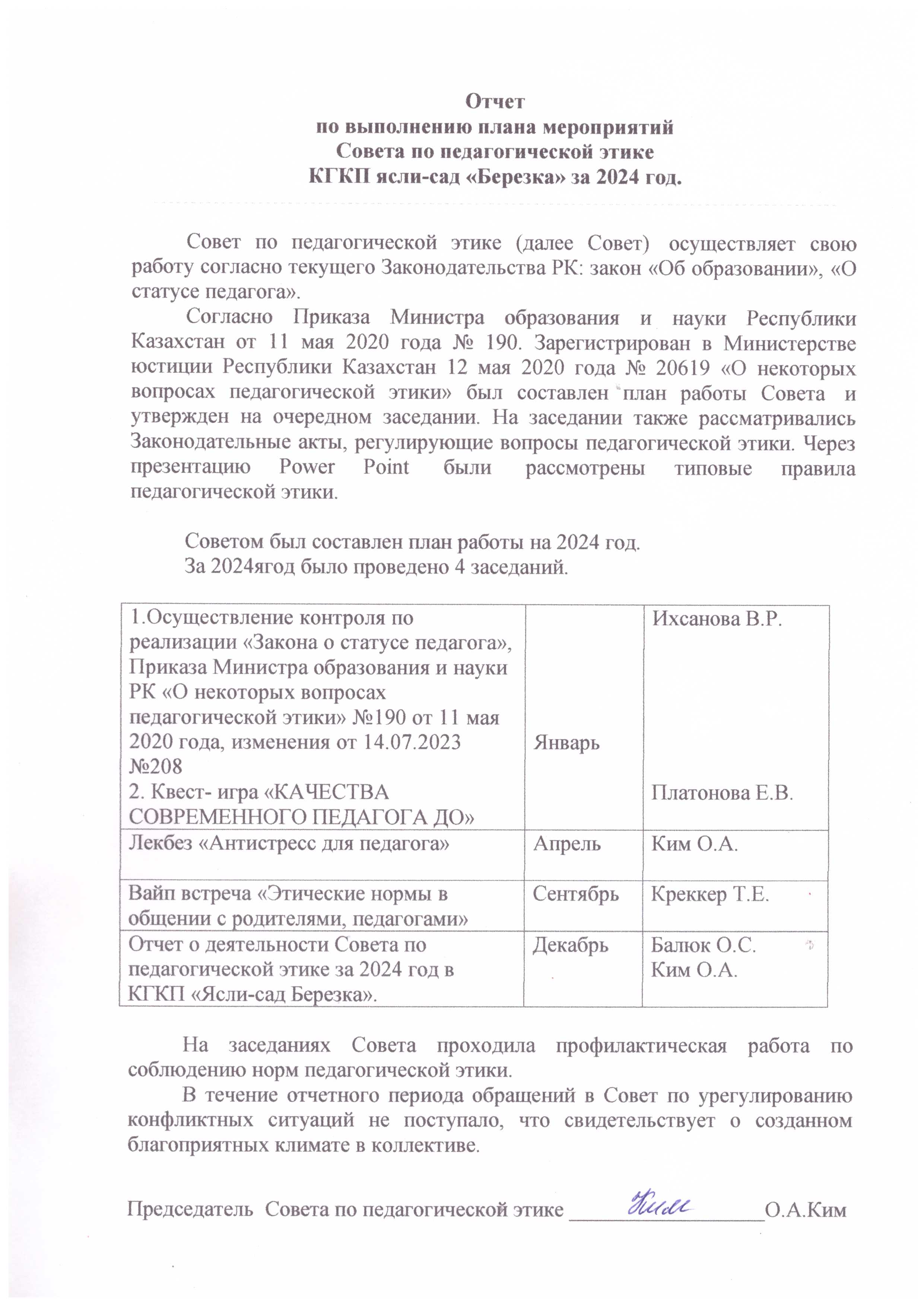 2024 жылға арналған "Березка" бөбекжайы КМҚК Педагогикалық әдеп жөніндегі кеңесінің іс-шаралары жоспарының орындалуы бойынша есебіЕсебі |