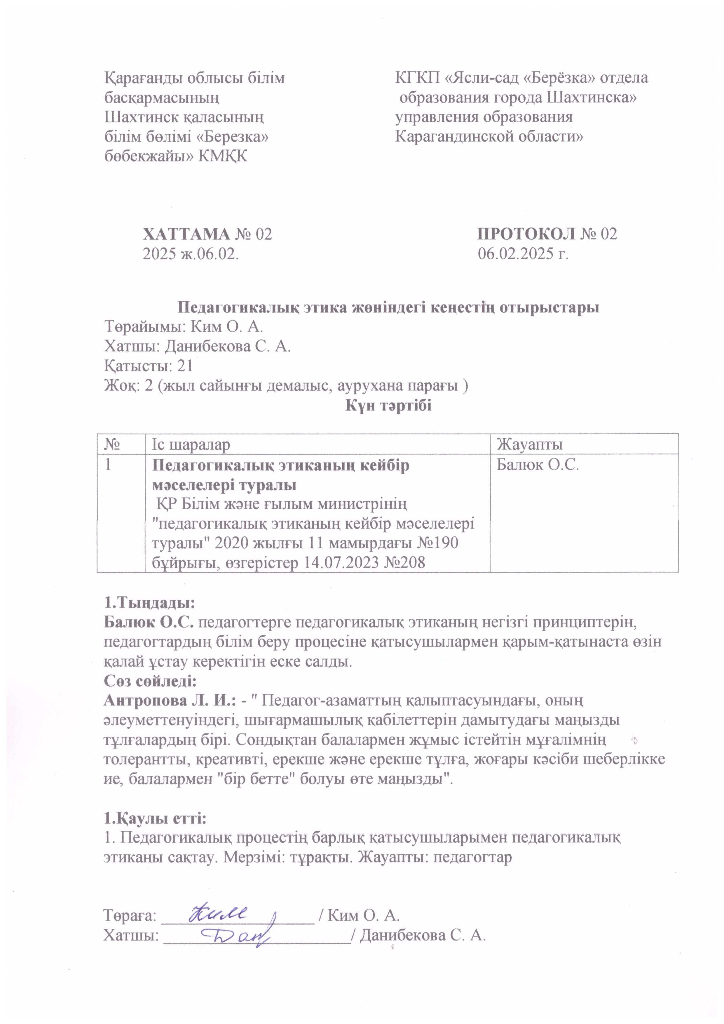 ХАТТАМА №02 Педагогикалық этика жөніндегі кеңестің отырыстарыХАТТАМА № 02 |