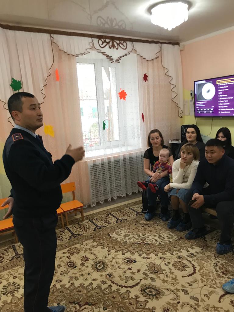2023 жылғы 9-қарашада «Болашақ әлемі» бөбекжай» КМҚК-нда балалардың қауіпсіздігін қамтамасыз ету бойынша ақпараттандыру деңгейін арттыру мақсатында учаскелік полиция инспекторы Қ.Мұсағұлдың қатысуымен «Күншуақ» мектепалды даярлық тобында ата-аналар жиналысы өтті. Полиция майоры ата-аналарды балалардың қатысуымен болған жазатайым оқиғаларға қатысты статистикалық мәліметтермен таныстырып, жаяу жүргіншілерге арналған жол ережелеріне егжей-тегжейлі тоқталды, сондай-ақ балалардың терезеден құлауы нәтижесінде болуы мүмкін қайғылы салдарға назар аударды. Сөзінің соңында инспектор К.Мұсағұл ата-аналар мен педагогтерге балаларды тәрбиелеуге және балалар жарақаттануының алдын алуға жауапкершілікпен қарайтыны үшін алғысын білдірді. В КГКП «Ясли-сад «Болашақ әлемі» 9 ноября 2023 года в целях повышения уровня информированности по обеспечению безопасности детей состоялось родительское собрание в группе предшкольной подготовки «Қүншуак» с присутствием участкового инспектора полиции К.Мусагул. Майор полиции познакомил родителей со статистическими данными, касающимися несчастных случаях с участием детей, подробно остановился на правилах дорожного движения для пешеходов, а так же заострил внимание о возможных трагических последствиях в результате выпадения детей из окон. В заключение своего выступления инспектор К.Мусагул поблагодарил родителей и педагогов за ответственное отношение к воспитанию детей и профилактике детского травматизма.