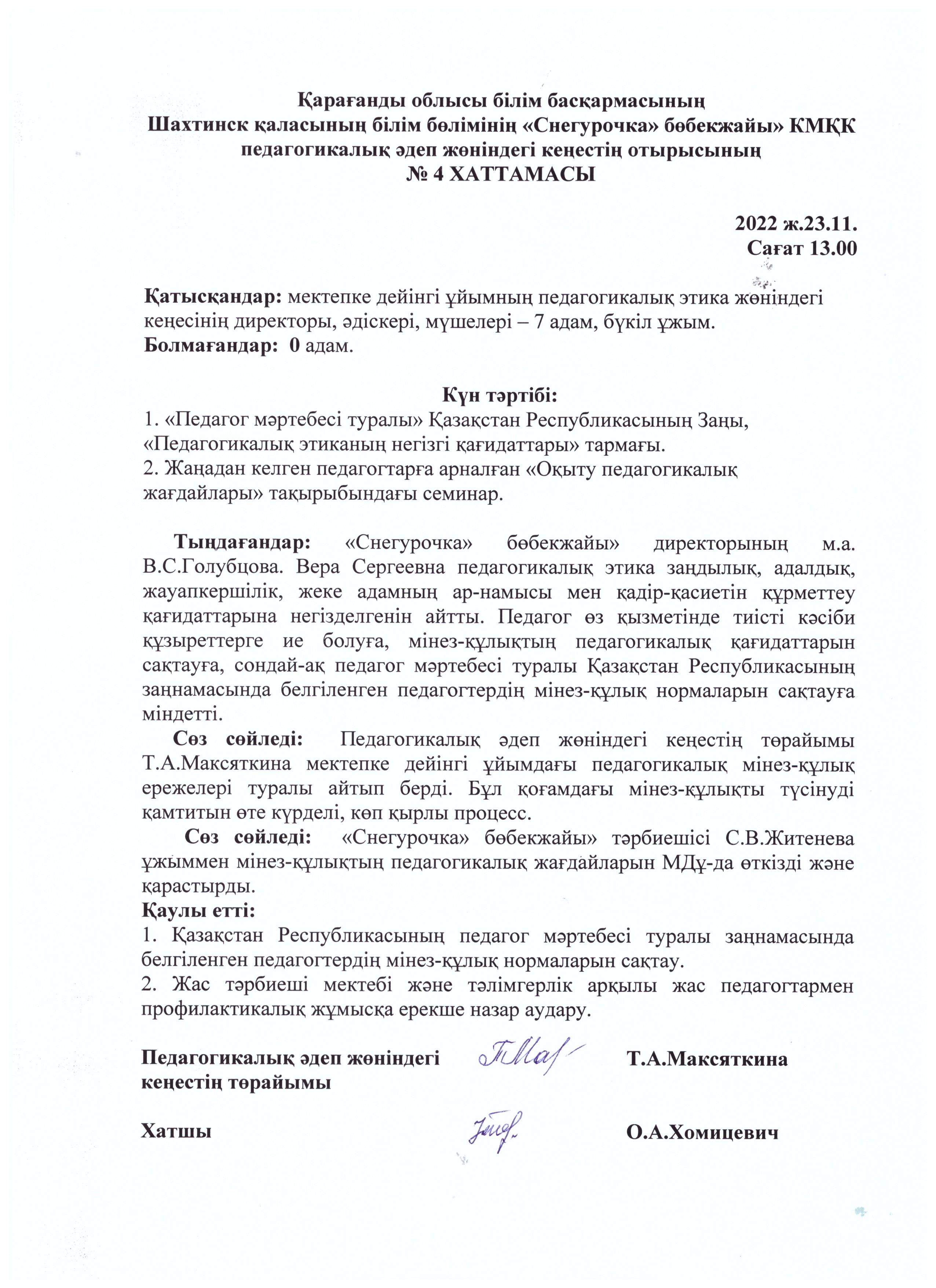 Педагогикалық әдеп жөніндегі кеңес отырысының № 4 хаттамасы23.11.2022 |