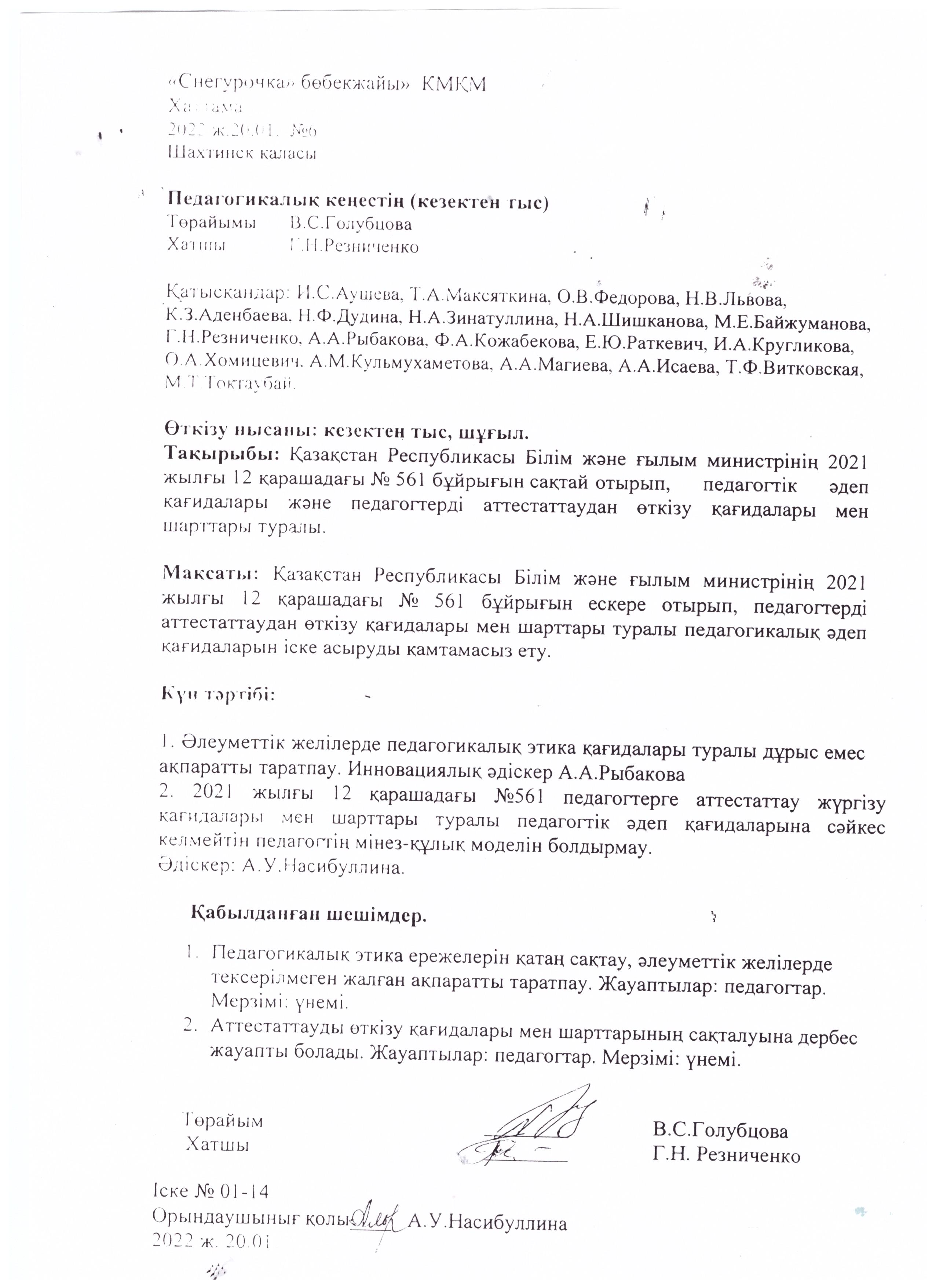 Педагогикалық кеңес №6 хаттамасы20.01.2022 |