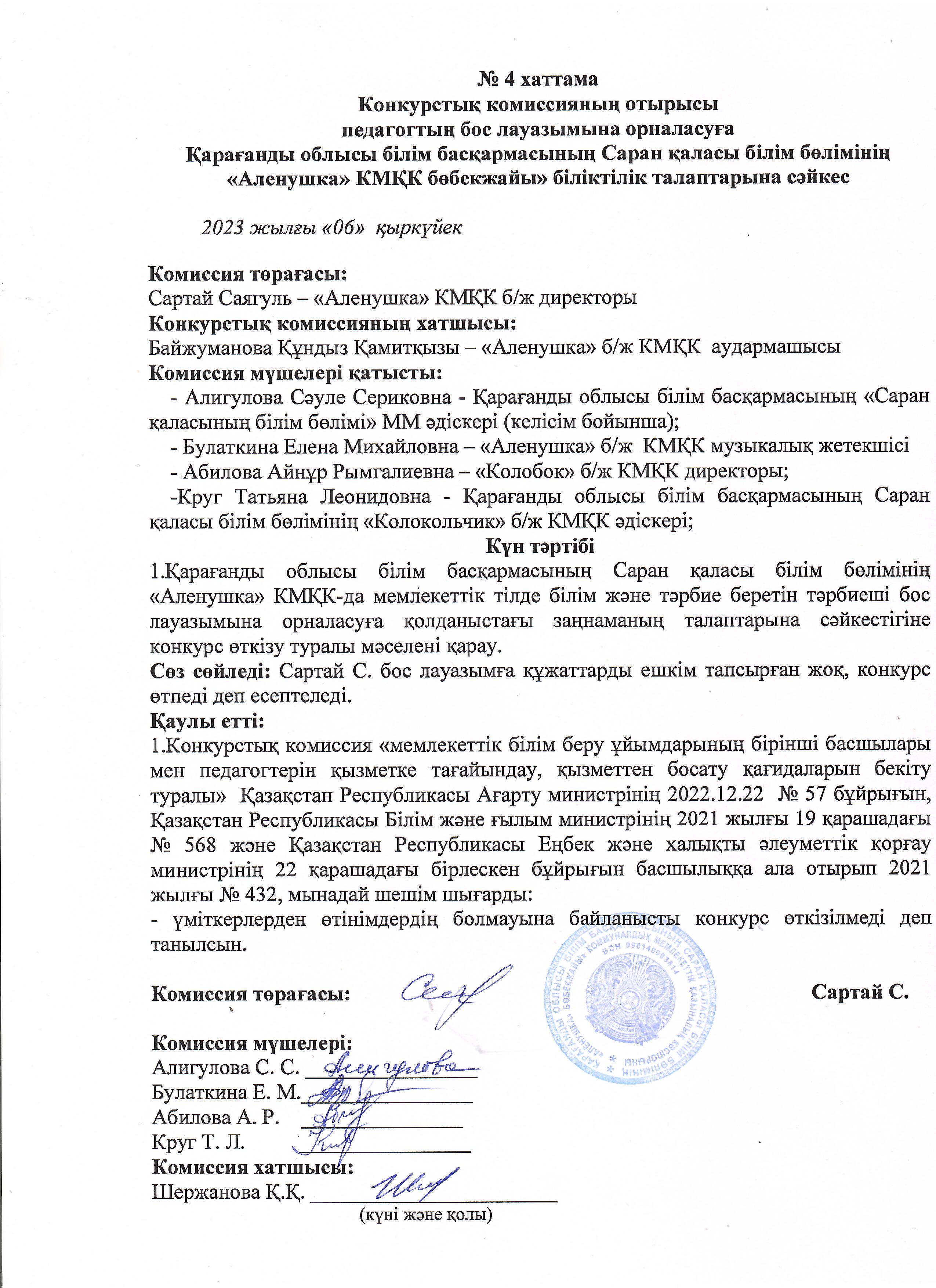 Заявления для участия принимаются в течение 7 рабочих дней после опубликования объявления по адресу: 100024, Карагандинская область, город Сарань, поселок Актас, улица Ленинградская, строение 14, телефоны: раб-5-50-45 электронная почта alenushka.de@mail.ru
