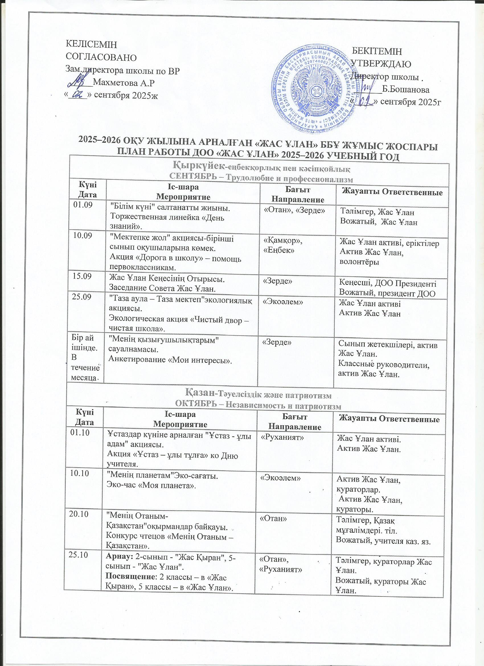 2025-2026 оқу жылына арналған "Жас Ұлан" БҰҰ жұмыс жоспарыПлан работы ДОО Жас Улан 2025-2026 учебный год 2 ст. |