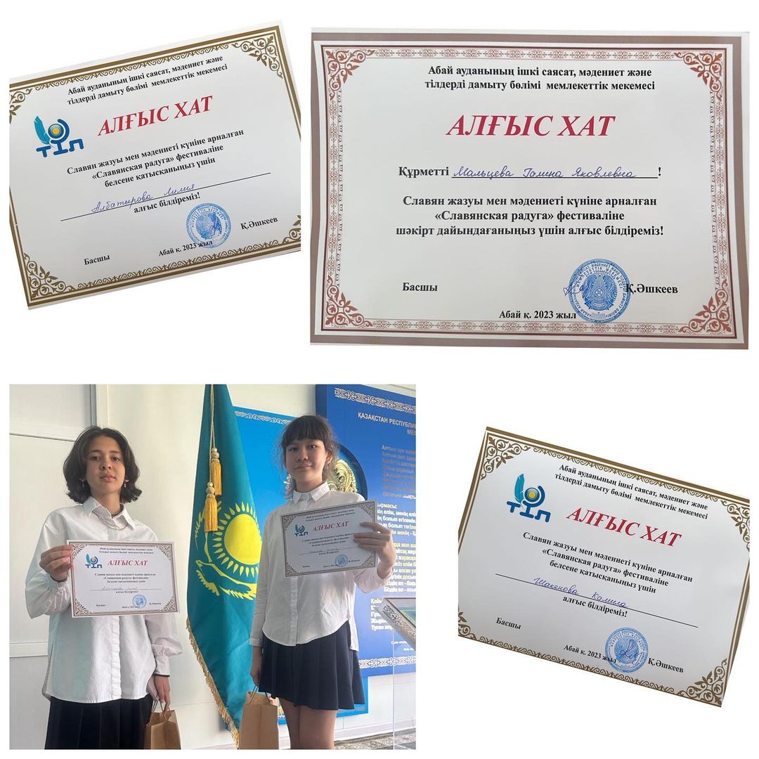 Благодарственное письмо от ГУ «Абайское районное управление внешней политики, культуры и развития языков». |