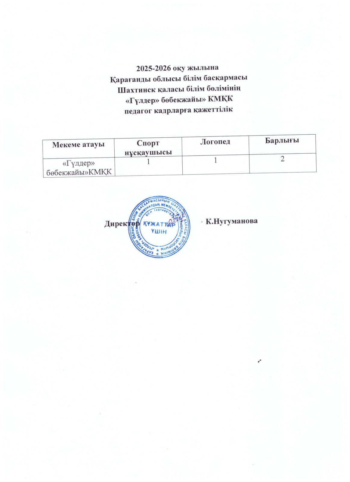 2025-2026 оқу жылына Қарағанды облысы білім басқармасы Шахтинск қаласы білім бөлімінің «Гүлдер» бөбекжайы» КМҚК педагог кадрларға қажеттілік2025-2026 оқу жылына