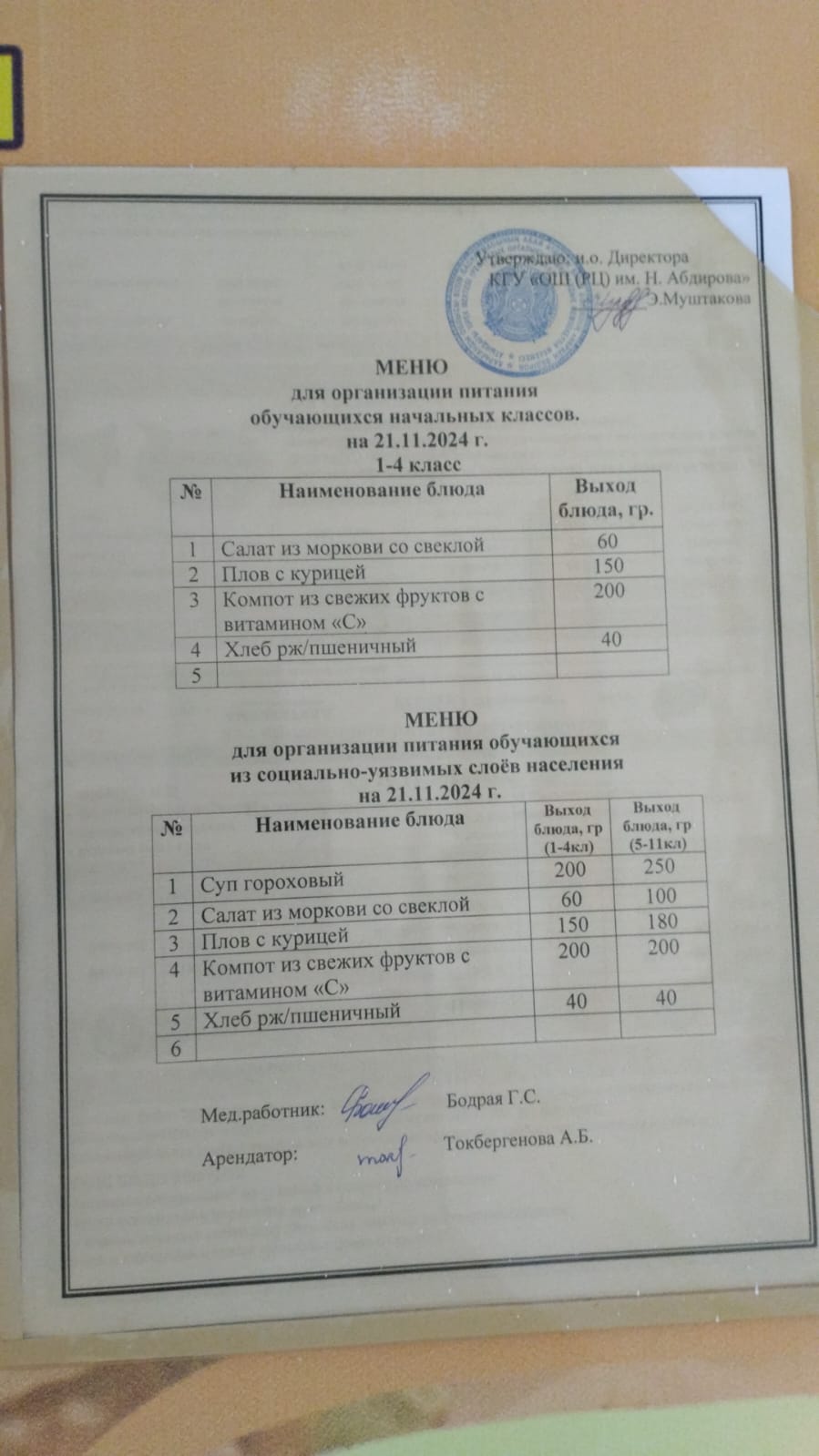 Мектептегі тамақтану 21.11.2024Мектептегі тамақтану. Әр балаға тамақ құны 520 теңге. |