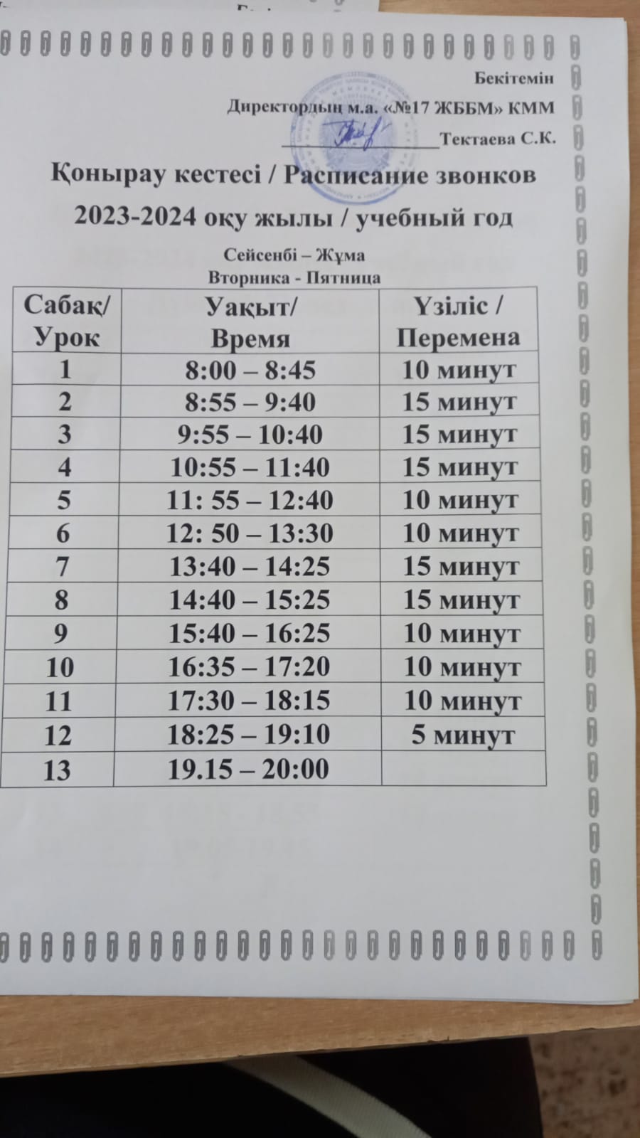 Қоңырау кестесі2023-2024 оқу жылының қоңырау кестесі |
