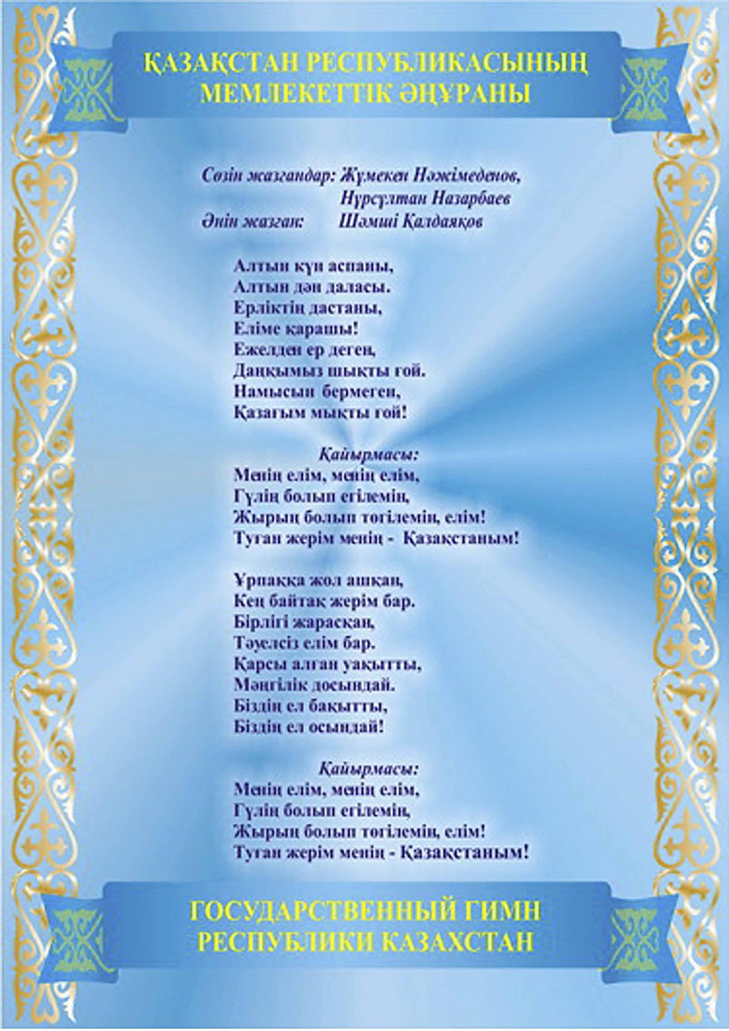 НАЦИОНАЛЬНЫЙ ГИМН РЕСПУБЛИКИ КАЗАХСТАНГимн является одним из главных символов государства. Термин «гимн» происходит от греческого слова «gymneo» и означает «торжественная песня». Гимн считается важным звуковым символом, имеющим основное значение для эффективной социально-политической группировки граждан страны и этнокультурного баланса. За всю историю независимого Казахстана государственный гимн страны был утвержден дважды – в 1992 и 2006 годах. После обретения республикой государственного суверенитета, в 1992 году, был объявлен конкурс на музыку и текст государственного гимна Казахстана. По результатам конкурса было принято решение о сохранении нотной редакции гимна Казахской ССР. Так, авторами музыки первого гимна независимого Казахстана стали Мукан Толебаев, Евгений Брусиловский и Латиф Хамиди. Кроме того, в конкурсе на лучший текст победил авторский коллектив, известные поэты Музафар Алимбаев, Кадыр Мырзалиев, Туманбай Молдагалиев и Жадыра Дарбаева. В целях повышения популярности звукового символа страны в 2006 году был принят новый национальный гимн. За основу была выбрана патриотическая песня «Мой Казахстан», широко известная в народе. Эта песня была написана Шамши Калдаяковым в 1956 году на слова Жумекена Нажимеденова. Президент Казахстана Нурсултан Назарбаев отредактировал первоначальный текст музыкального произведения, чтобы придать песне более высокий статус национального гимна и сделать ее более торжественной. 6 января 2006 года Парламент Казахстана на совместном заседании Палат внес соответствующие изменения в Декрет «О государственных символах» и утвердил новый Государственный гимн страны. Авторы: Нурсултан Назарбаев и Жумекен Нажимеденов, музыка Шамши Калдаякова, текст и музыка Государственного Гимна Республики Казахстан: золотое солнце небо Поле золотого зерна, Сага о мужестве, Посмотрите на мою страну! С давних времен говорят, Мы стали известными. Он не отдал чести, Мой казах сильный! Припев : Моя страна, моя страна я буду твоим цветком Я изольюсь, как песня, моя страна! Моя родина Казахстан! Проложил путь для поколения, У меня большая земля. Единство совершенное, Есть независимая страна. Полученное время, Как твой вечный друг. Наша страна счастлива Это наша страна! Припев : Моя страна, моя страна я буду твоим цветком Я изольюсь, как песня, моя страна! Моя родина Казахстан! |