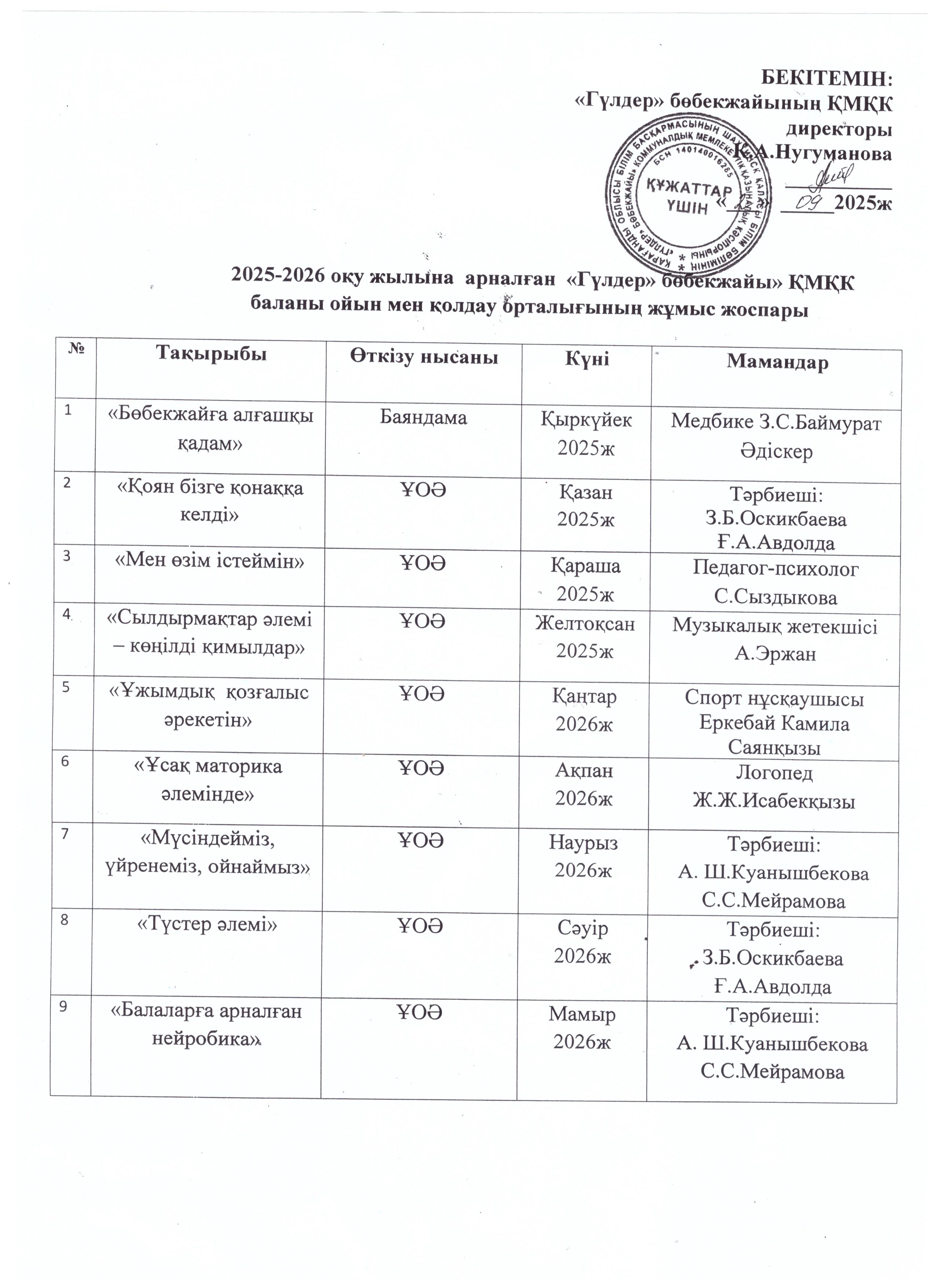 Сырттай балабақша 2025-2026 оқу жылына арналған баланы ойын мен қолдау орталығының жұмыс жоспары |