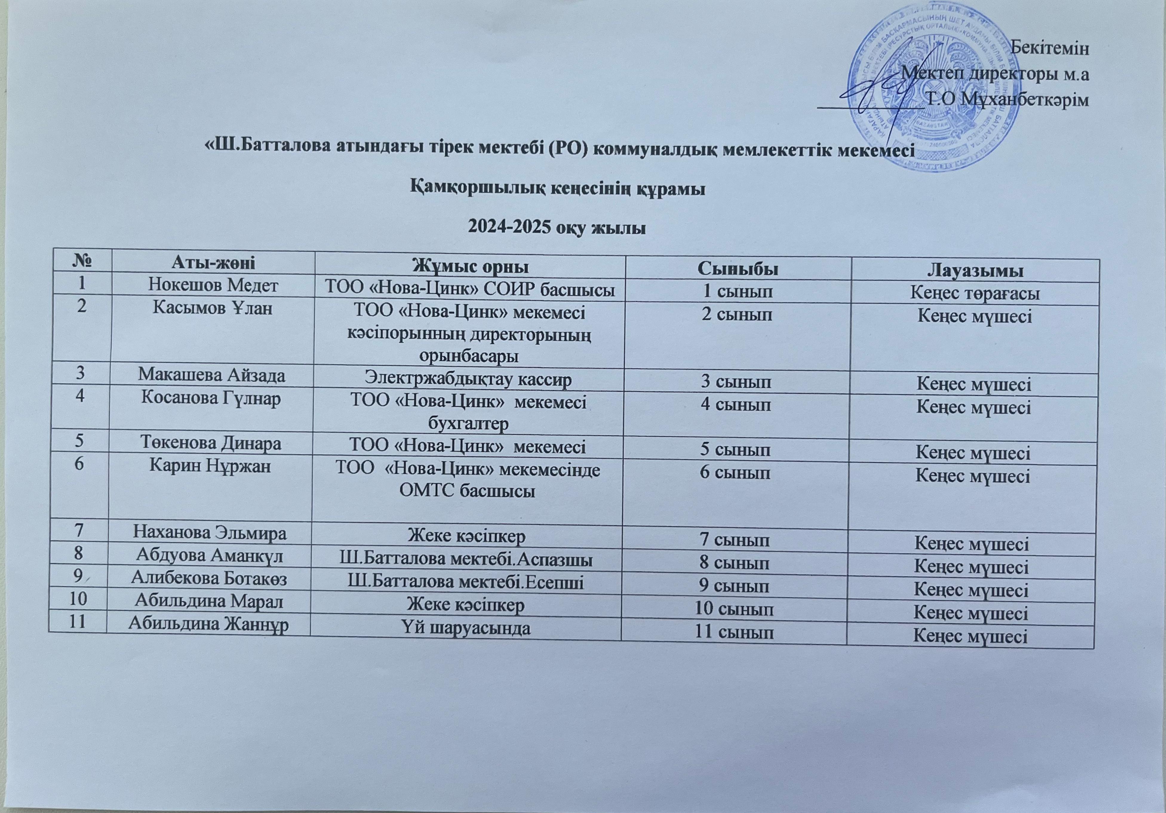Қамқоршылық кеңесіҚазақстан Республикасы Білім және Ғылым министрлігінің 2017 жылғы 27шілдедегі № 355 бұйрығымен бекітілген.”Білім беру ұйымдарында қамқоршылық кенестің жұмысын ұйымдастыру және оны сайлау тәртібінің үлгілік қағида негізінде Ш. Батталова атындағы ТМ(РО) мектепте қолдау көрсету мақсатында қамқоршылық кеңесі төменгідей құрамда бекітілді |
