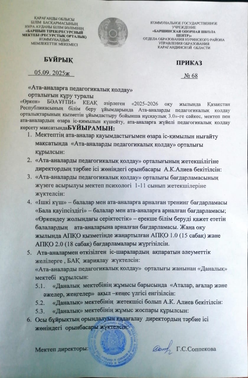 АПҚО бұйрығыАта-аналарды педагогикалық қолдау орталығының бұйрығы |