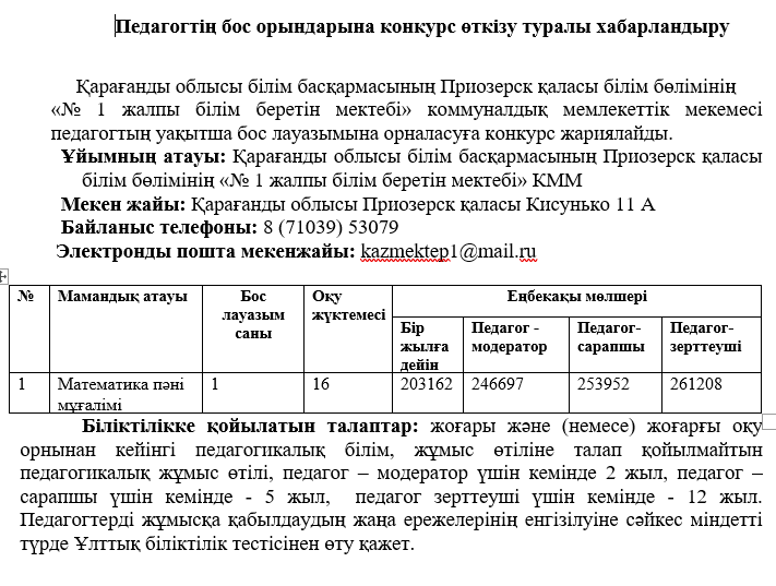 Педагогтің бос орындарына конкурс өткізу туралы хабарландыруҚарағанды облысы білім басқармасының Приозерск қаласы білім бөлімінің