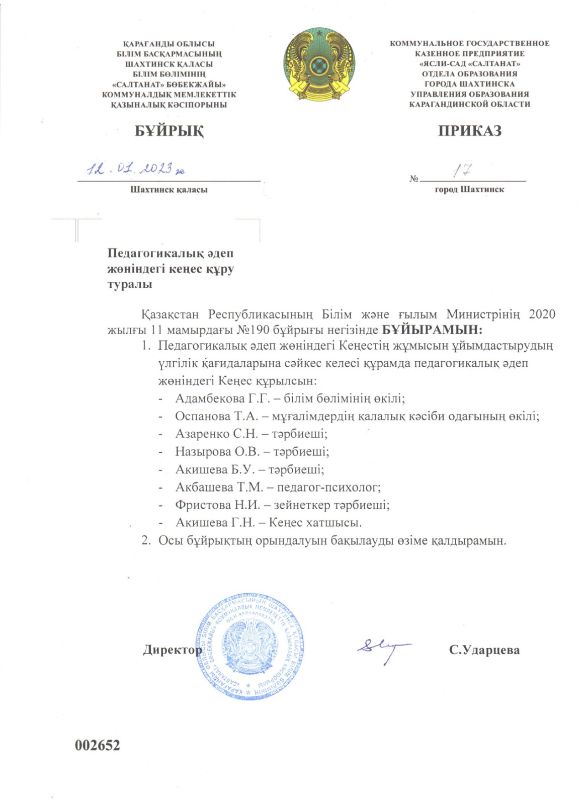 Педагогикалық әдеп жөніндегі Кеңес құру туралы№17 бұйрық |