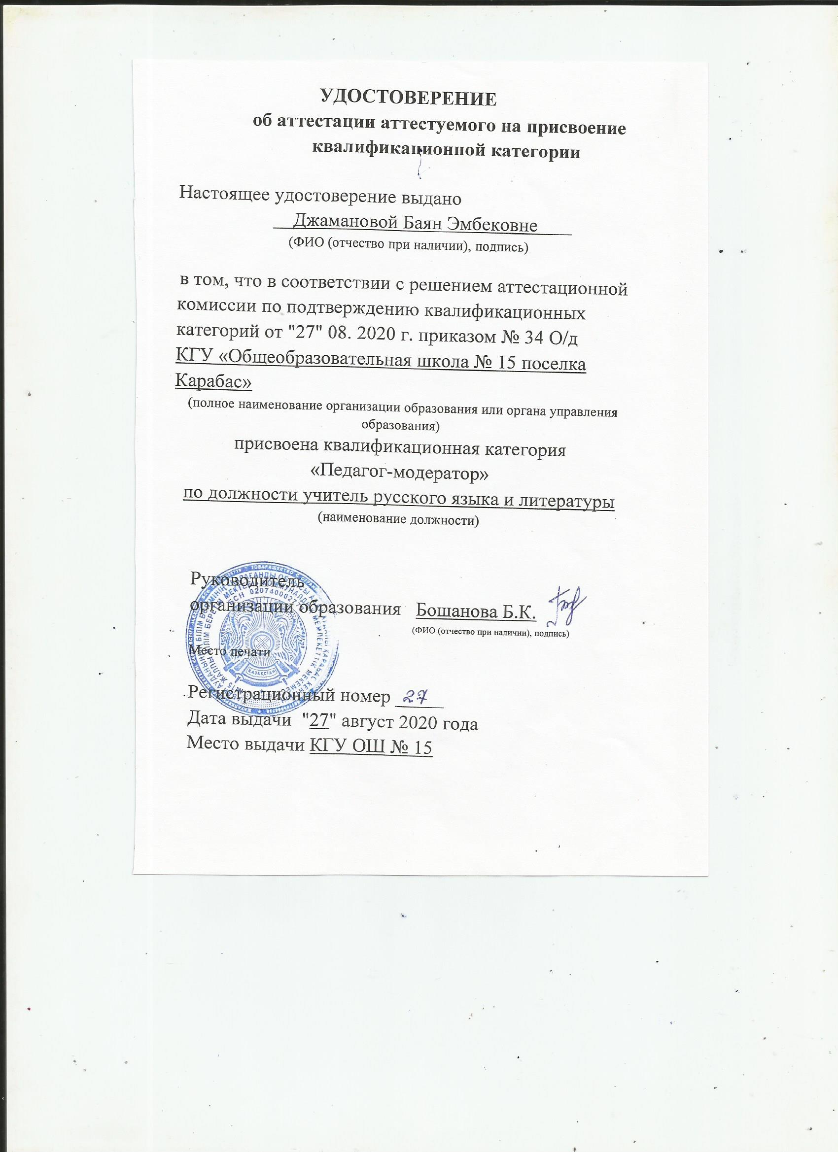 Біліктілік санатын беру туралы педагог куәлігіДжаманова Баян Эмбековна |