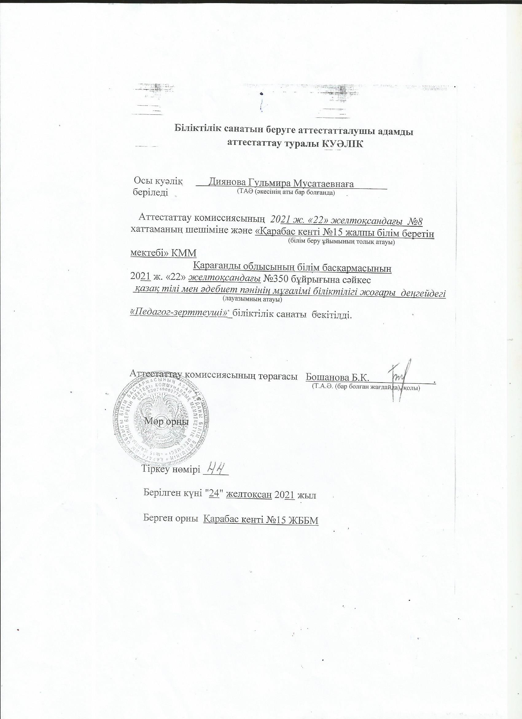 Біліктілік санатын беру туралы педагог куәлігіДиянова Гульмира Мусатаевна |