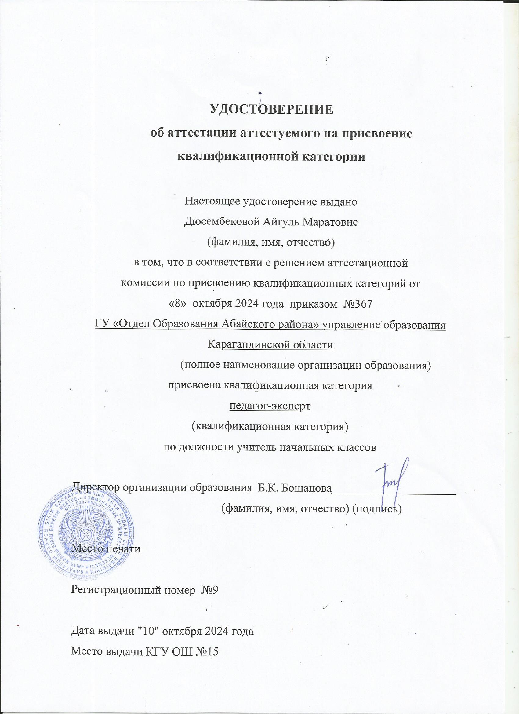 Біліктілік санатын беру туралы педагог куәлігіДюсембекова Айгуль Мараткызы |