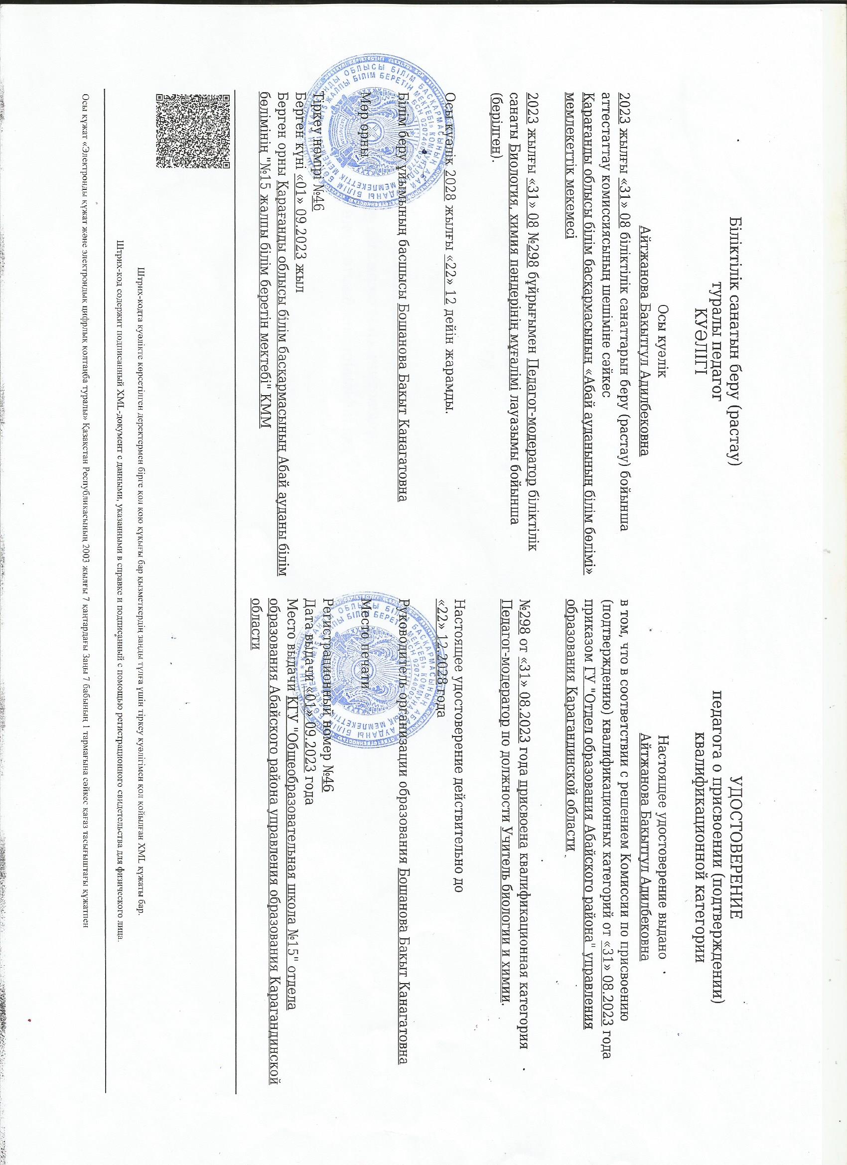 Біліктілік санатын беру туралы педагог куәлігіАйтжанова Бакытгул Адилбековна |