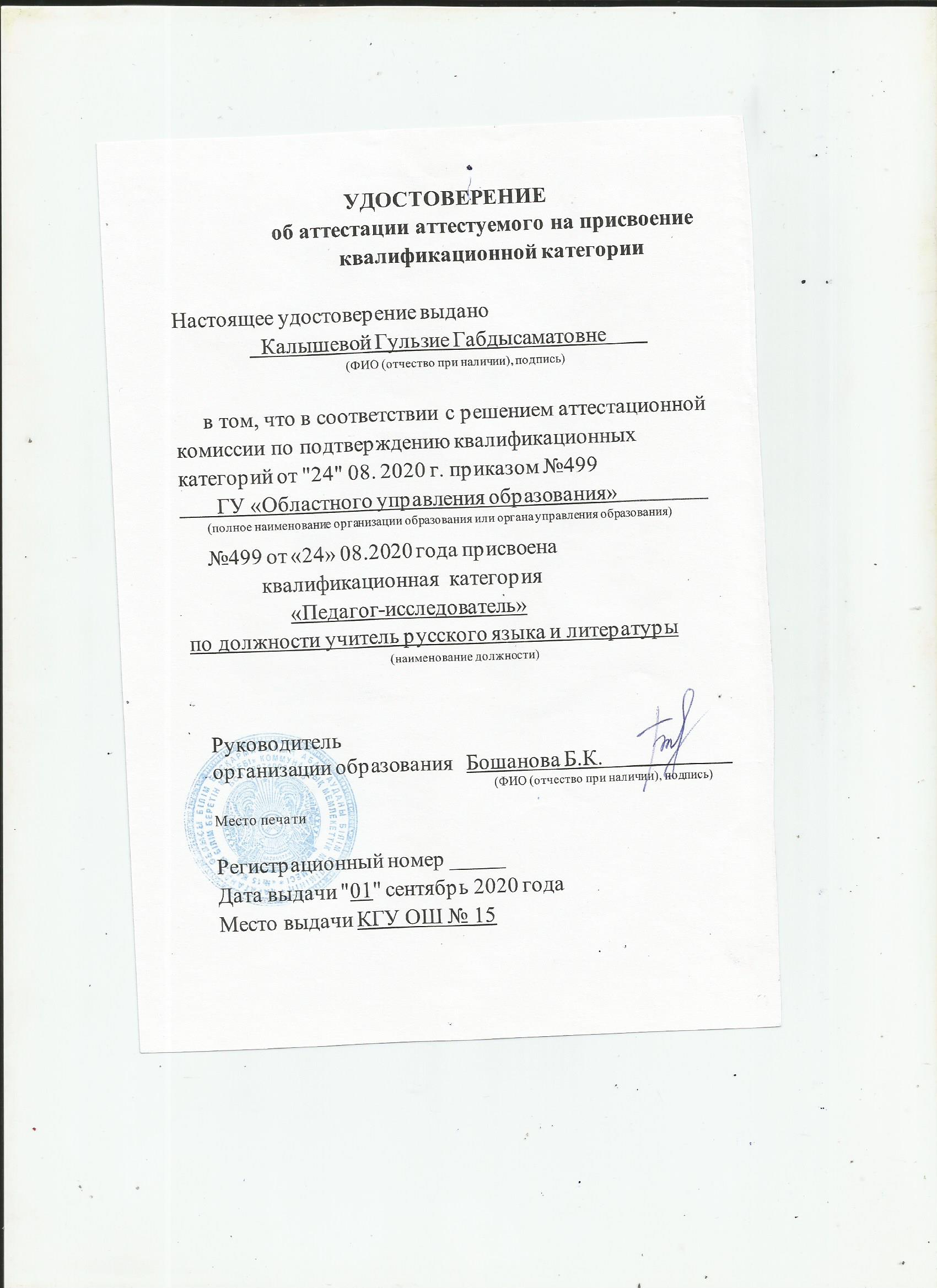 Біліктілік санатын беру туралы педагог куәлігіКалышева Гульзия Габдысаматовна |