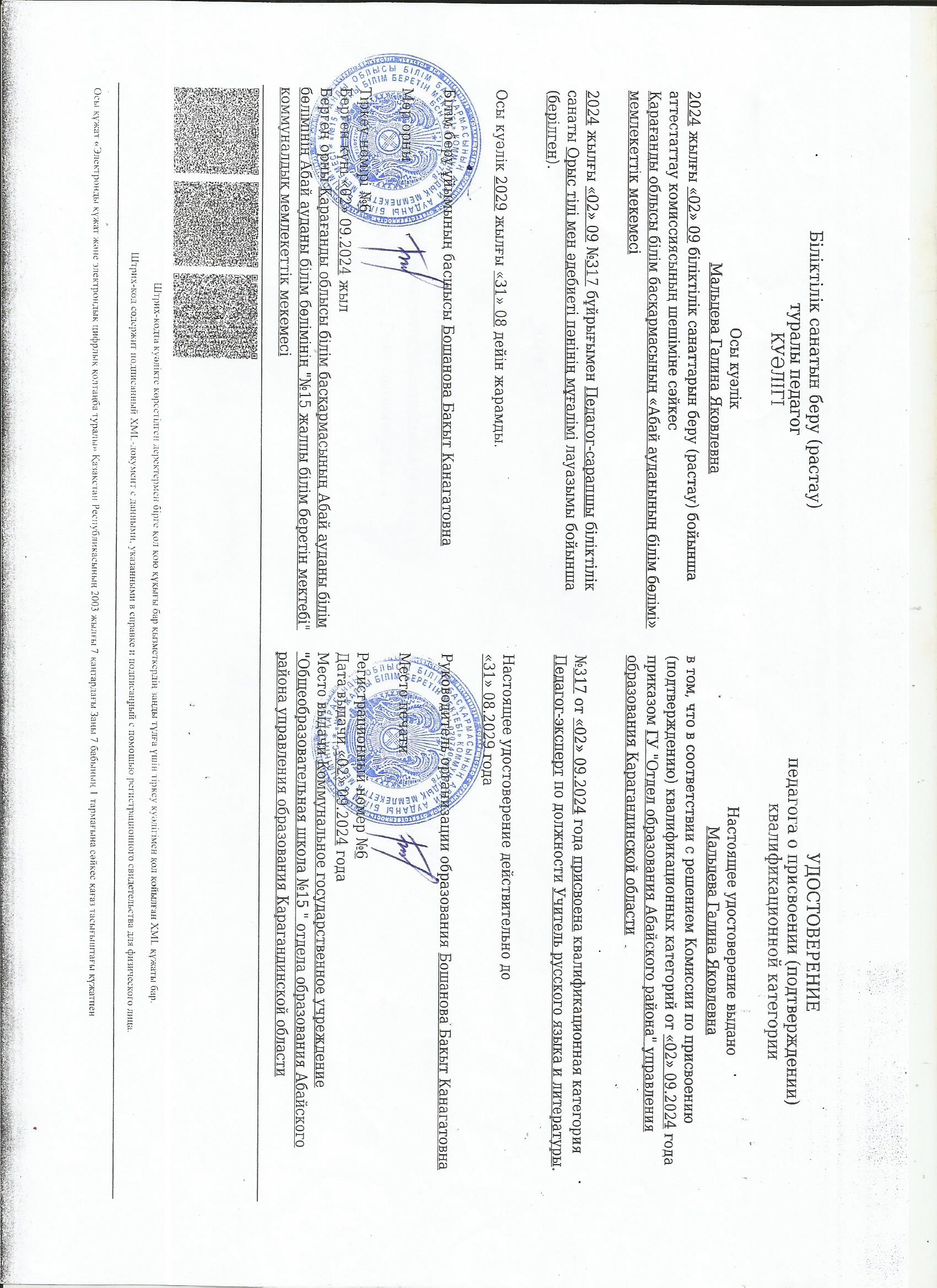 Біліктілік санатын беру туралы педагог куәлігіМальцева Галина Яковлевна |