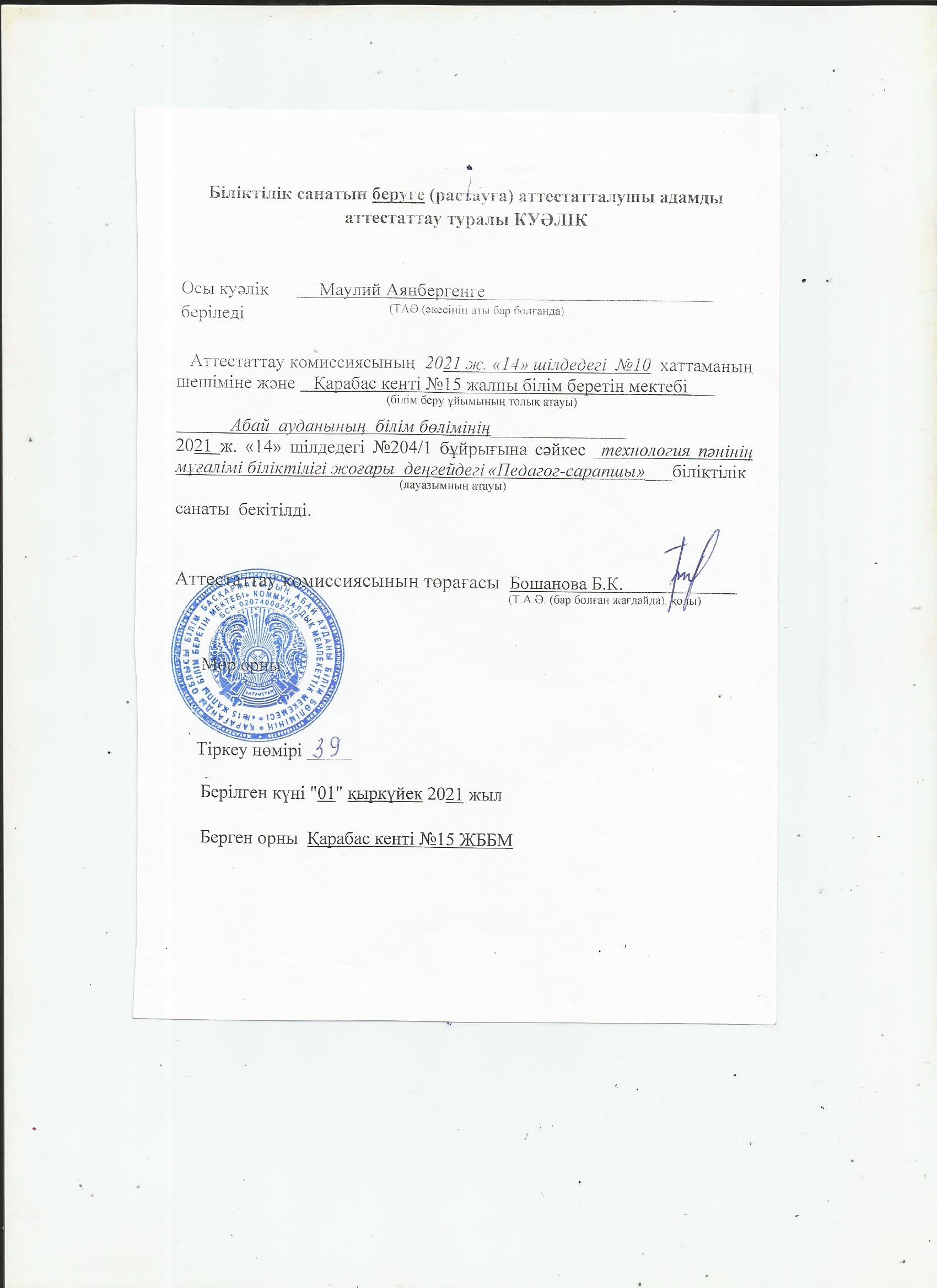 Біліктілік санатын беру туралы педагог куәлігіМаулий Аянберген |