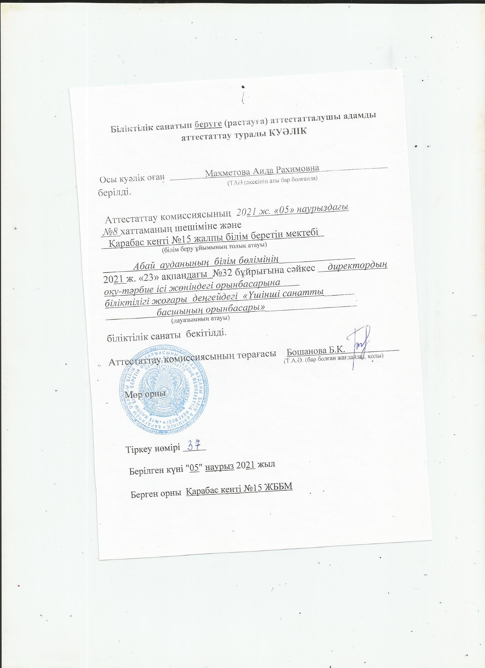 Біліктілік санатын беру туралы педагог куәлігіМахметова Аида Рахимовна |