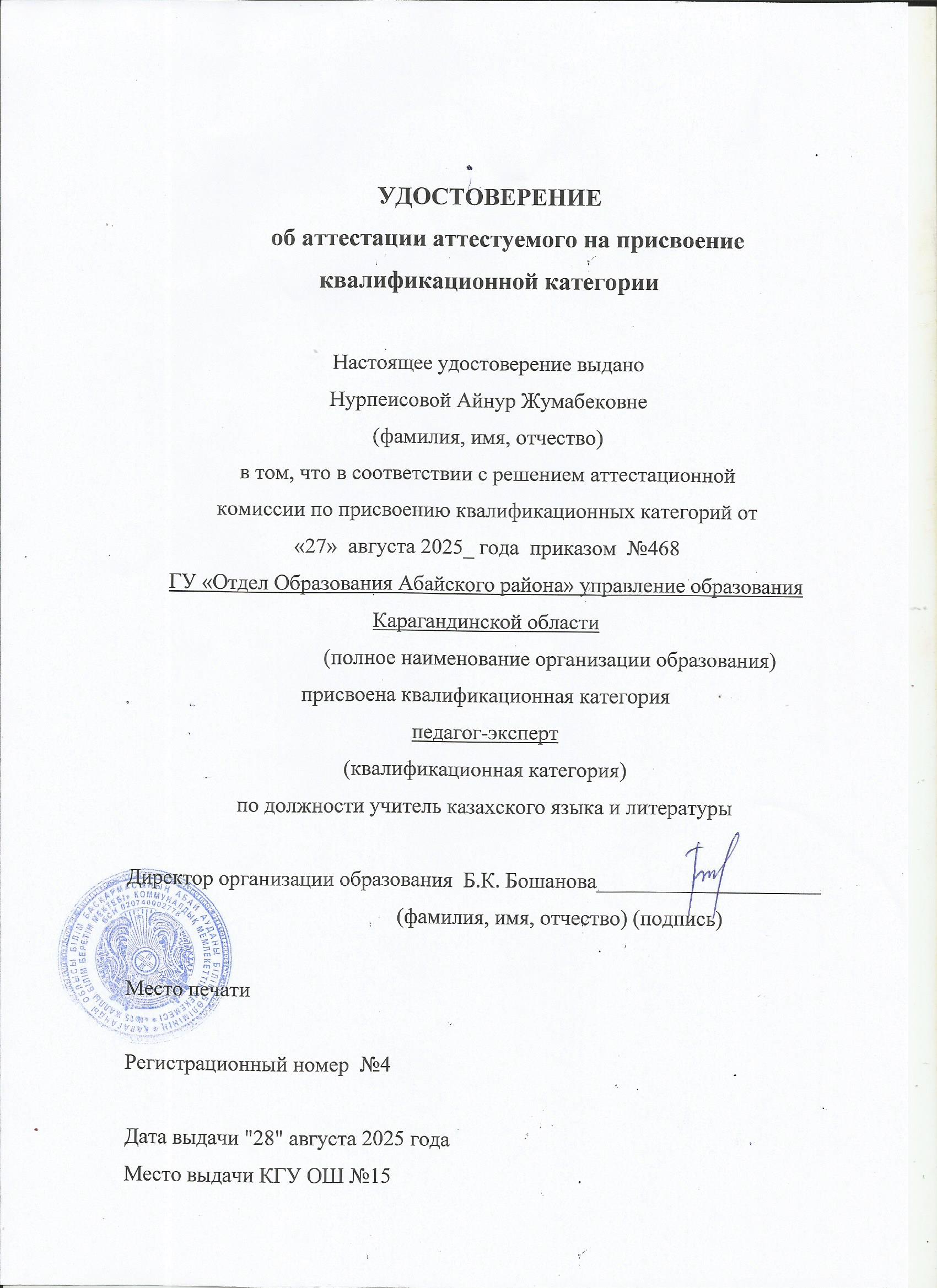 Біліктілік санатын беру туралы педагог куәлігіНурпеисова Айнур Жумабековна |