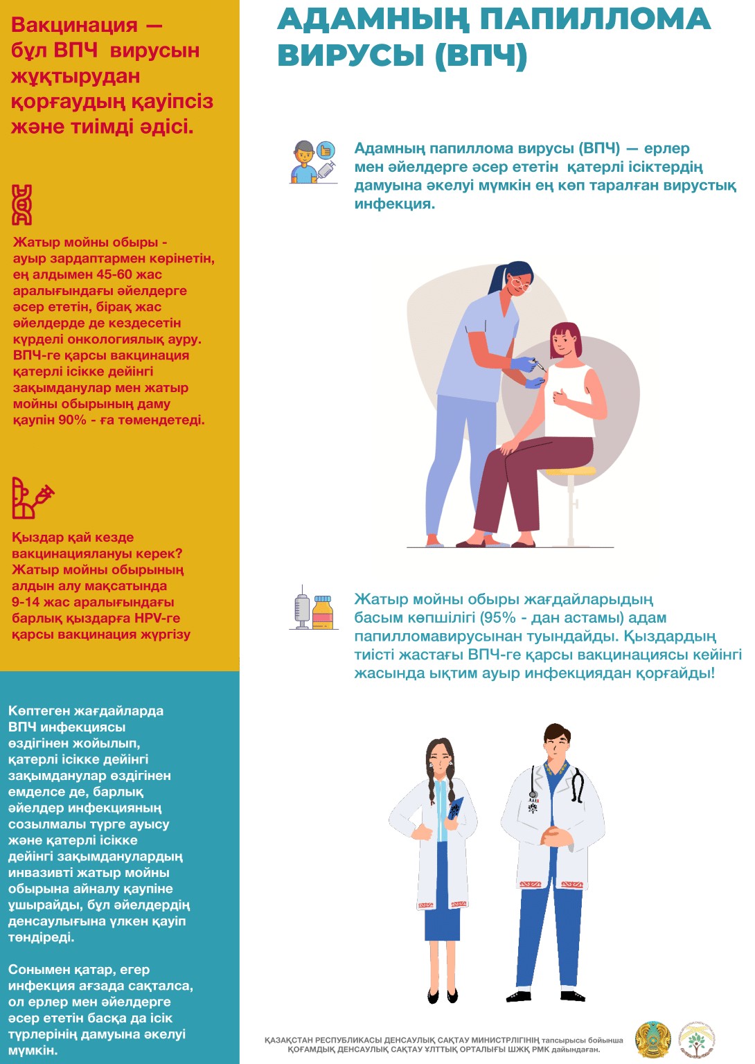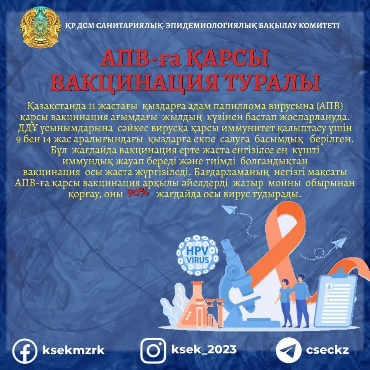 Адам папиллома вирусына қарсы вакцинациялау ҚР Ұлттық егу күнтізбесіне енгізілді, екпе ата-аналардың ақпараттық келісімімен, тегін жүргізілетін болады.